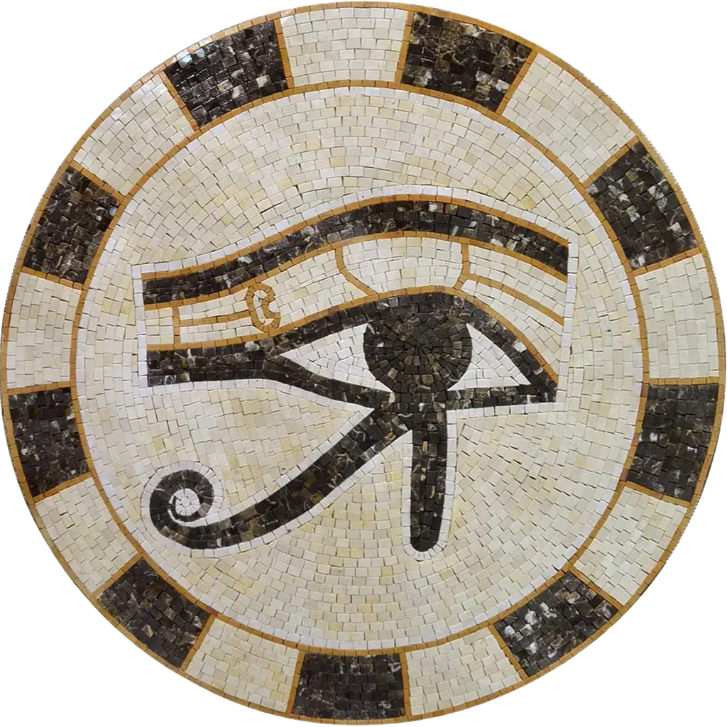 Egyptian Medallion Pattern The Eye of Horus this rondure makes a stylish table or counter top overlay. This mosaic medallion represents an ancient Egyptian myth that deals with the times of the Pharaohs. It is known as the "Sound Eye" that is regarded as a powerful protective amulet. This piece will make a vibrant addition to your home decor! "