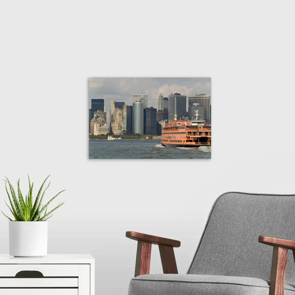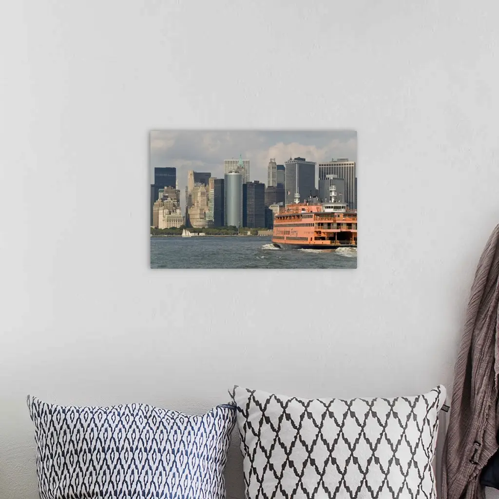 The famous orange Staten Island Ferry approaches lower Manhattan, New York wall art for home and office decor. Discover canvas art prints, photos, mural, big canvas art and framed wall art in GreatBigCanvas.com's varied collections.