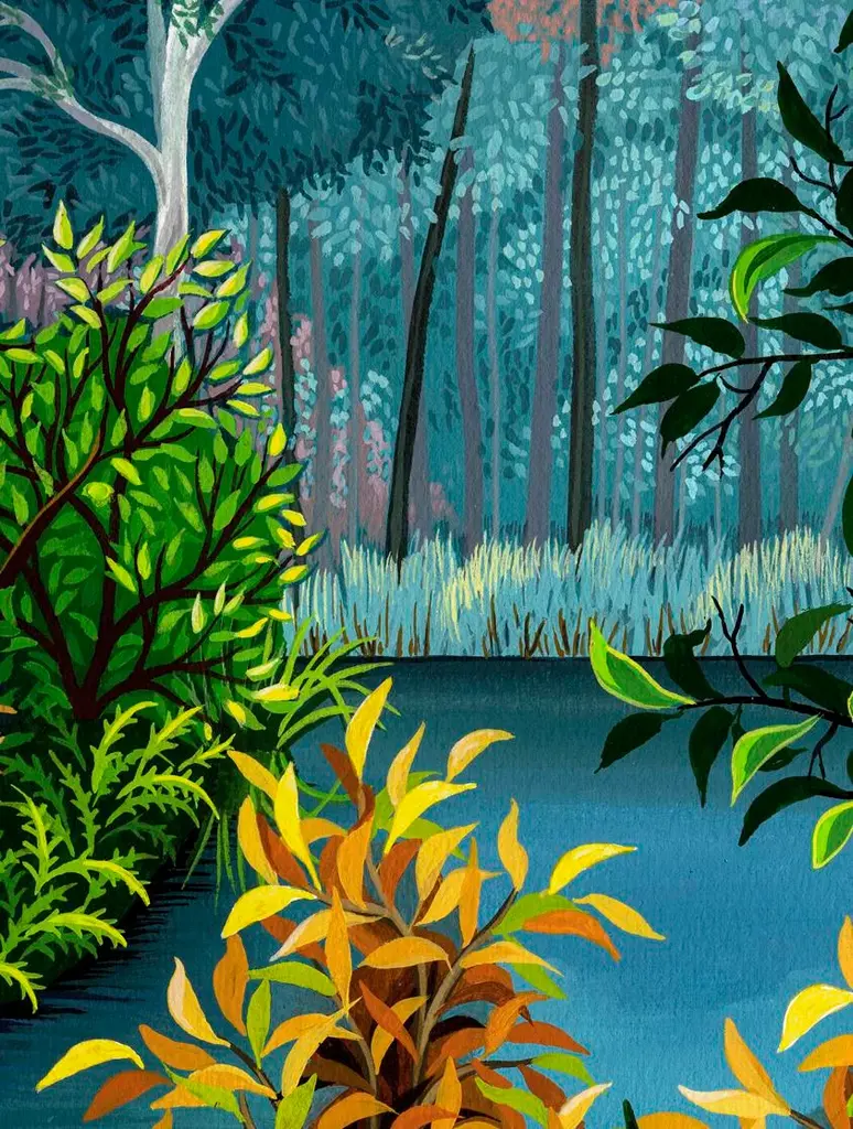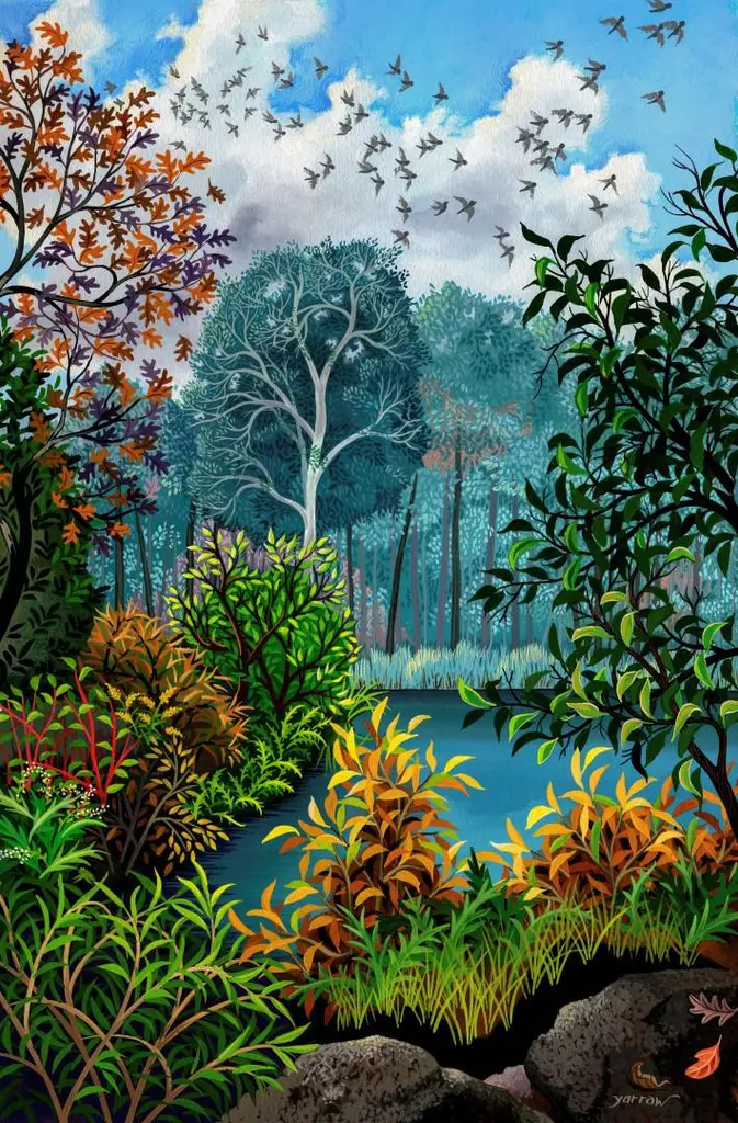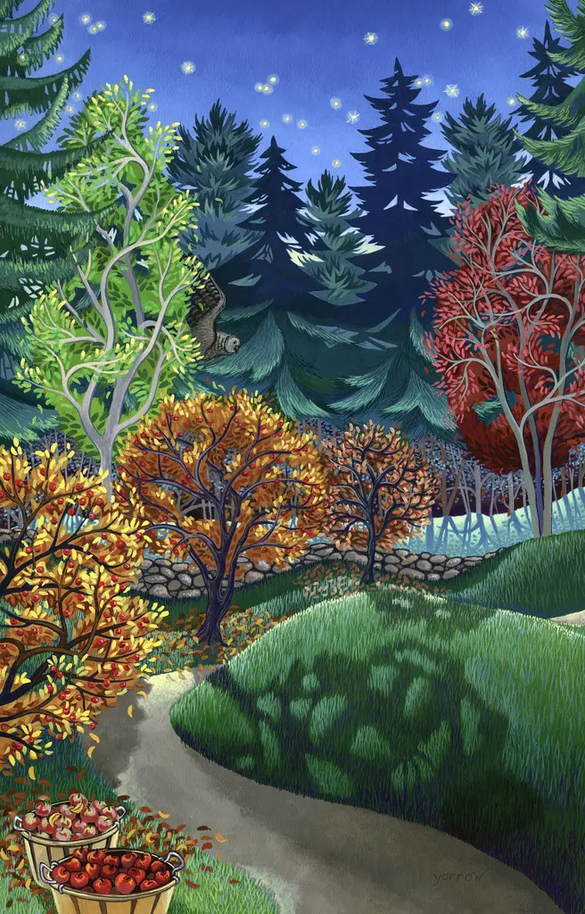 Pure crisp colors of autumn enliven this beautifully reproduced giclee landscape by US artist Wynn Yarrow. Known for her sense of color and exquisite detail, Wynn Yarrow works in acrylic gouache. Her landscape is carefully printed on archival heavyweight (340gsm) paper with lightfast inks for maximum longevity. The limited edition of 200 (inclusive of all sizes) is signed and numbered on the bottom. Image size is 20" x 30" on 24" x 36" paper. Unframed print ships rolled in a tube. Included is a certificate of authenticity.