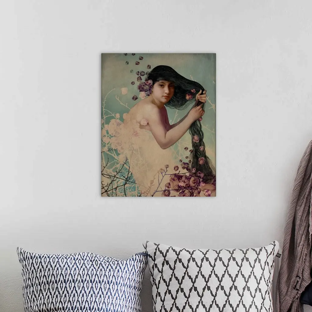 A lady is running her fingers through her long, dark hair while she is surrounded by flowers.