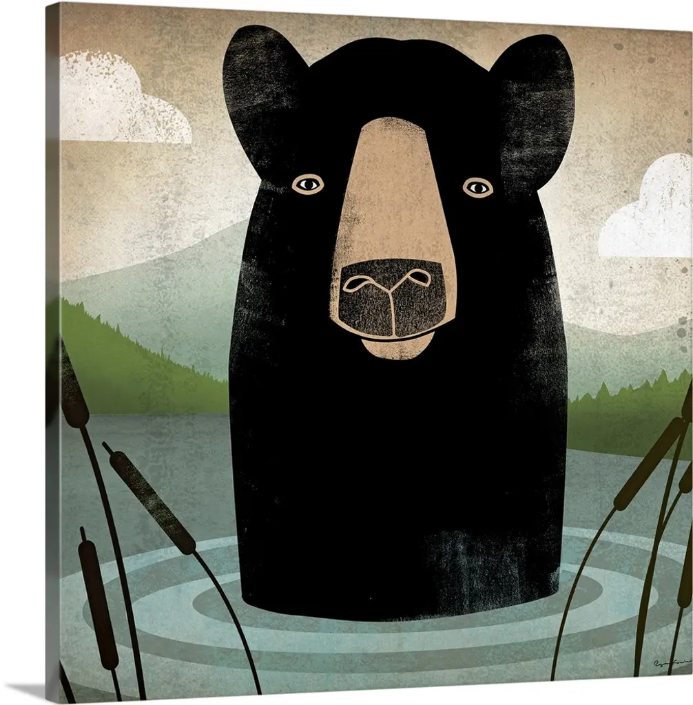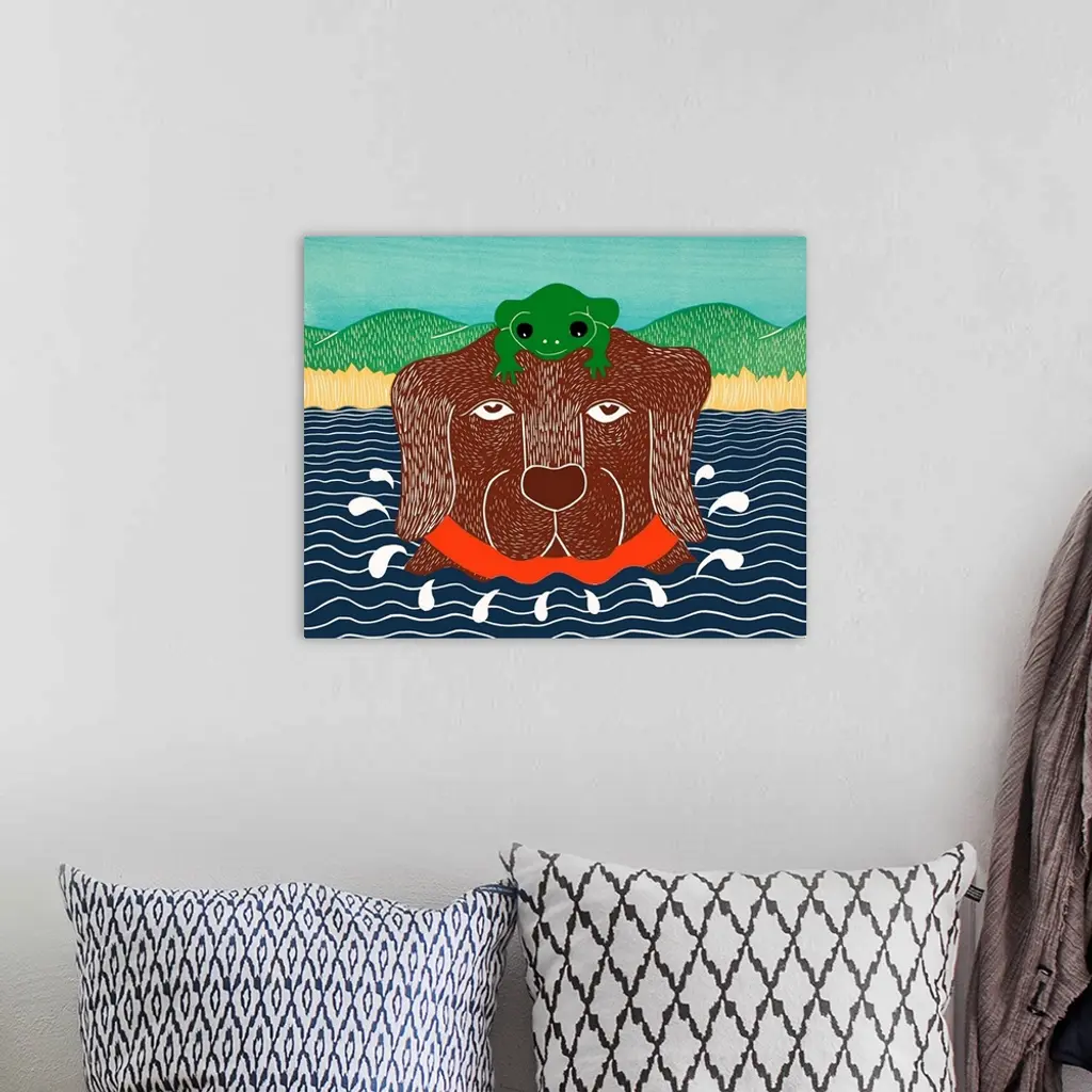 Illustration of a chocolate lab in the water with a green frog on its head.