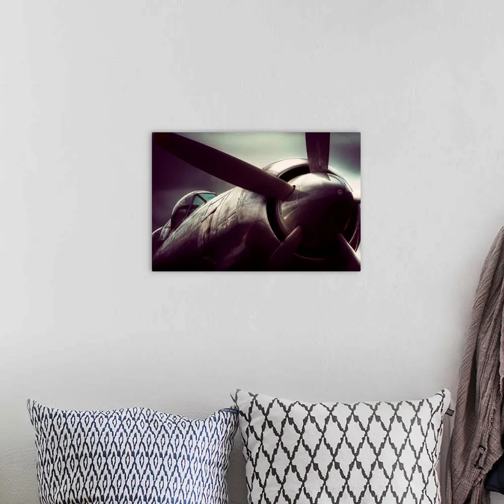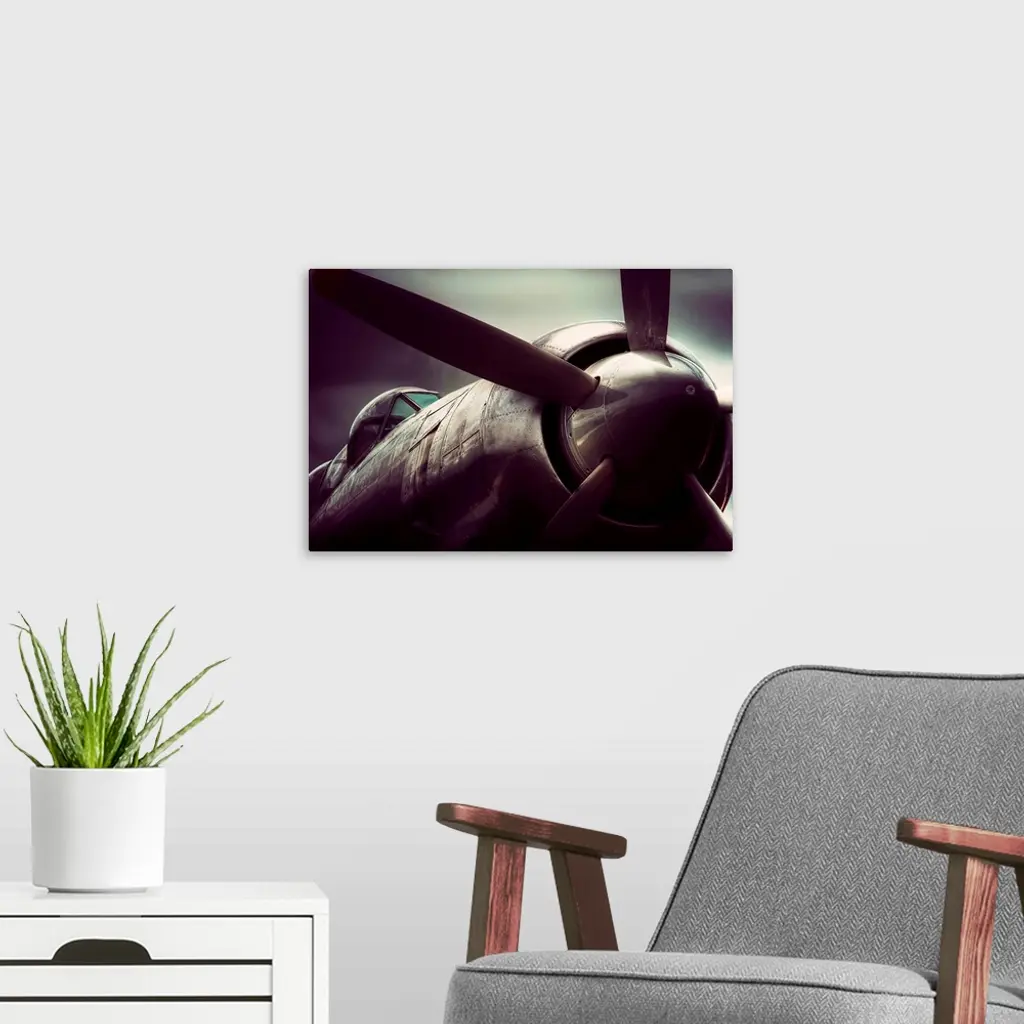 Big, horizontal, close up, fine art photograph of a SeaFury T20, showing the propeller and cockpit, against a blurred background.