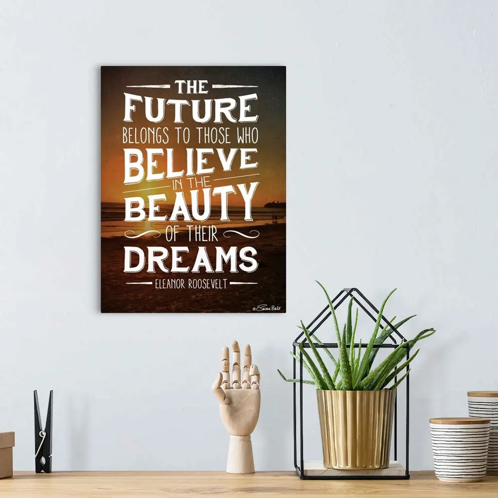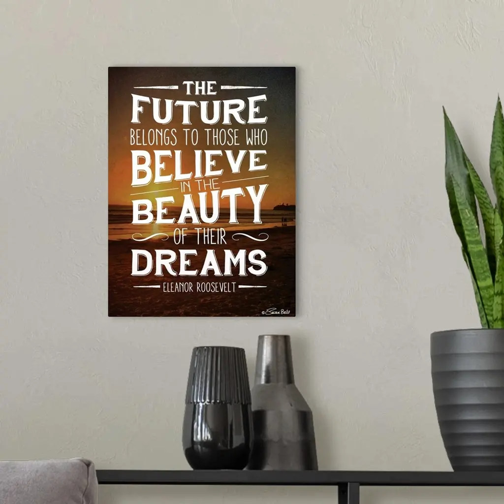 Inspirational quote in white lettering against a photograph of a beach at sunset