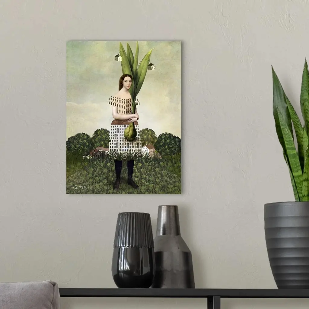 A young lady is holding a large plant with tiny houses hanging from it. Her dress has the pattern of house windows and she is standing in a field in front of a row of houses.