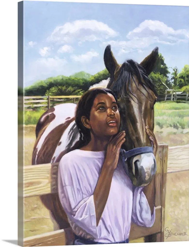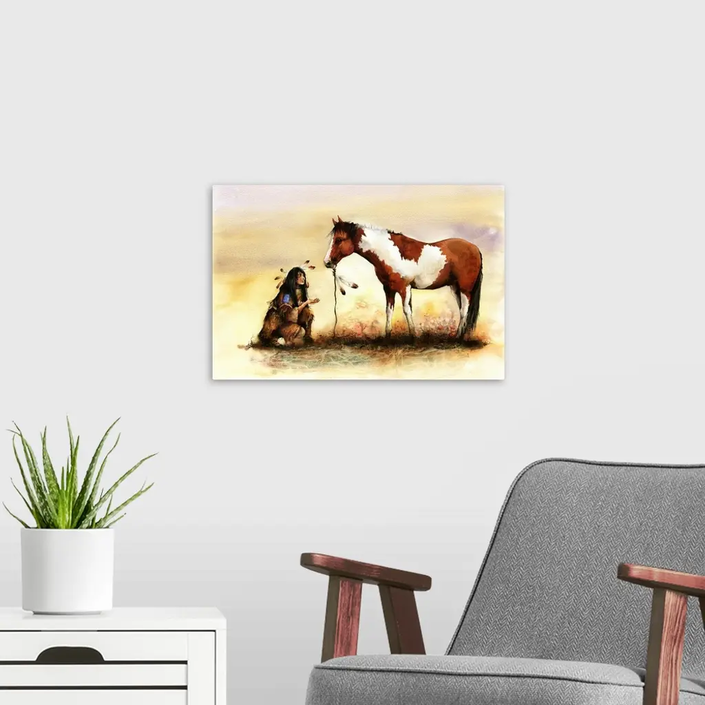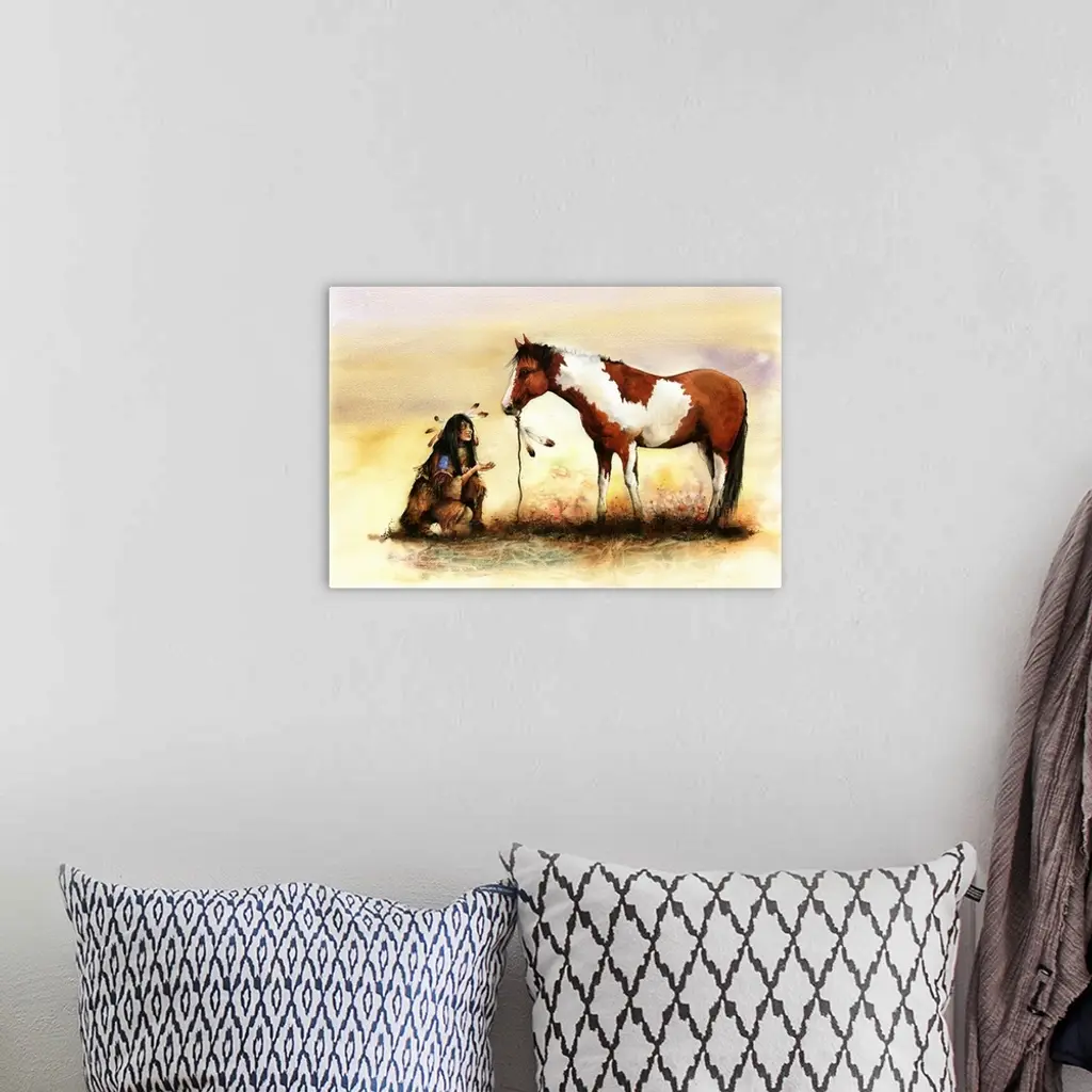 A Native American Indian girl offers a treat to an Indian pony. Originally painted with watercolour on paper.