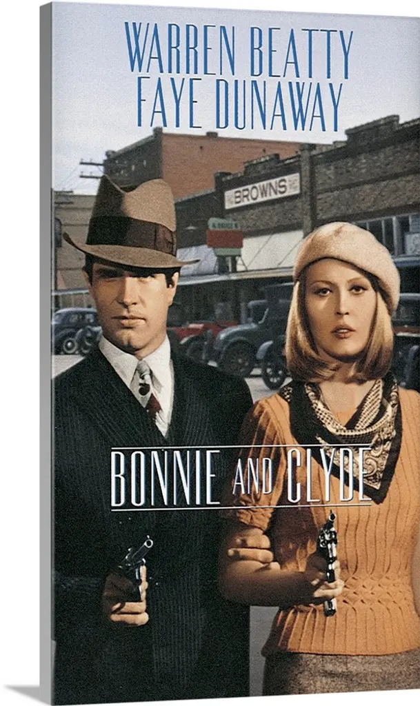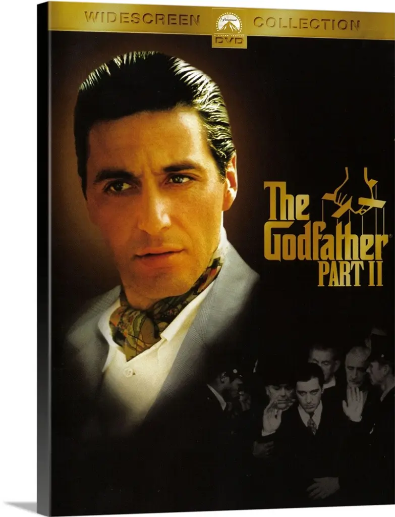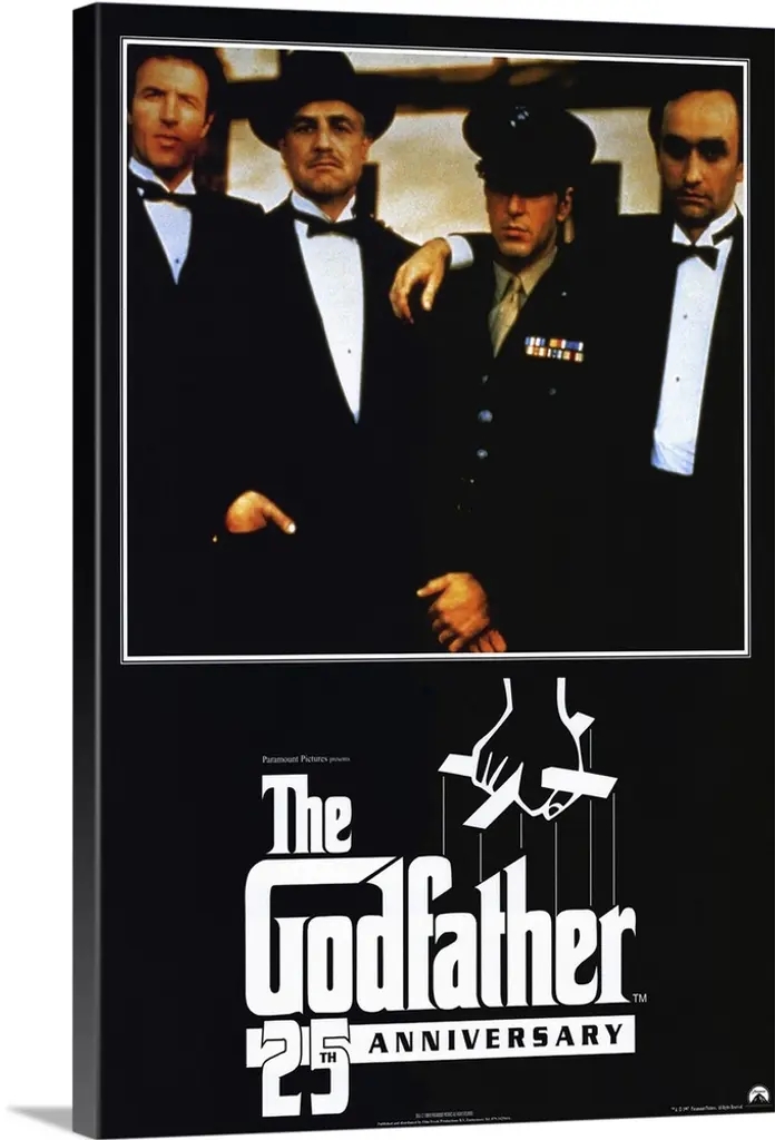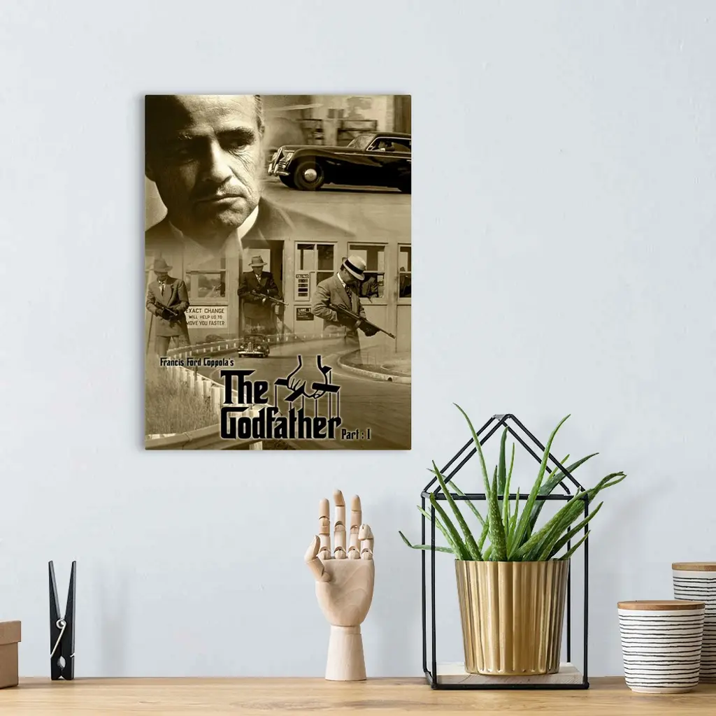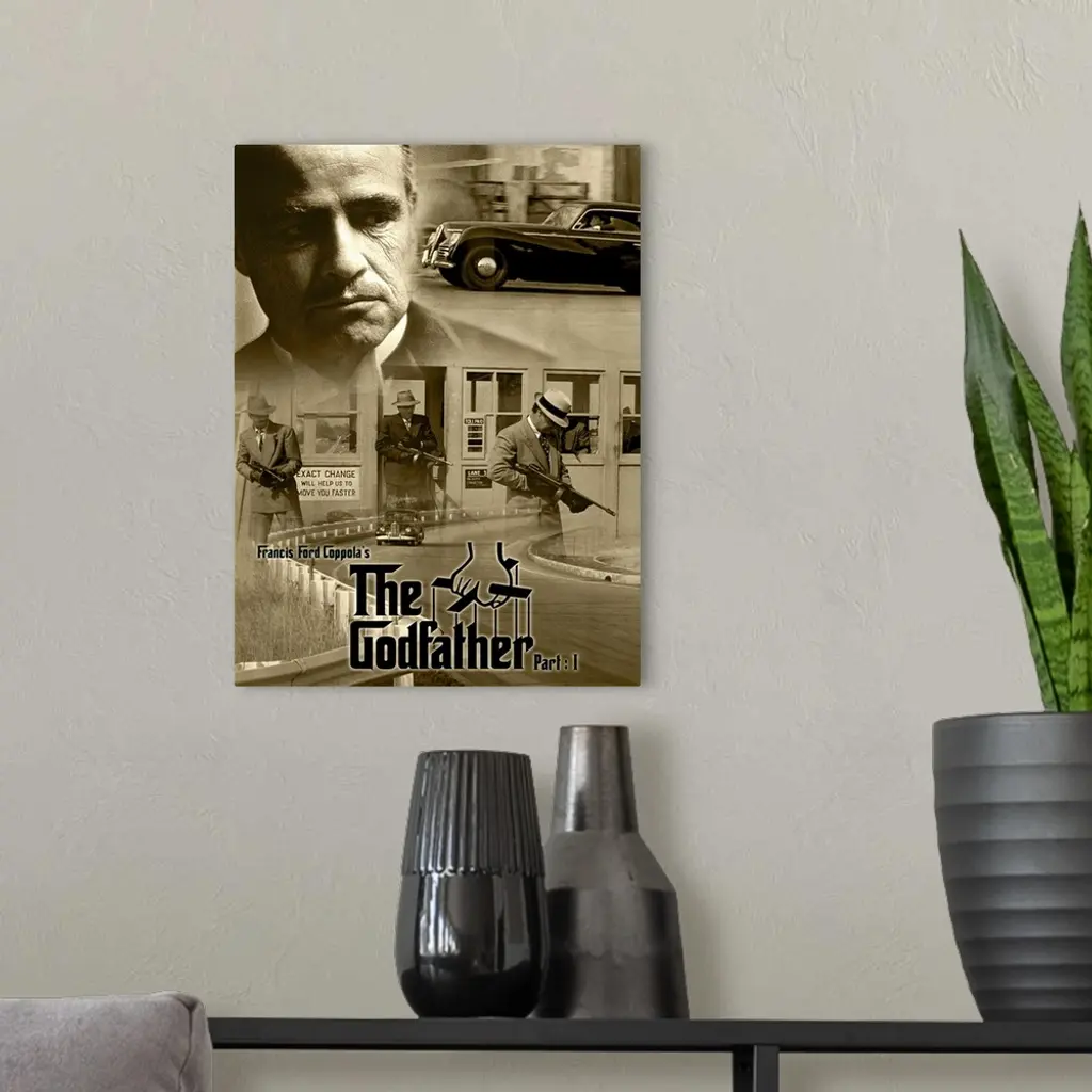 Vertical, large movie advertisement for the 1972 film, The Godfather. The movie title is on a collaged background of imagery from the movie, including several cast members, cars racing down street and several men with guns.