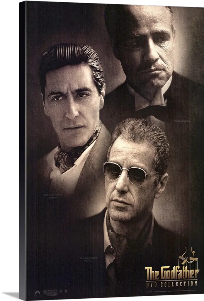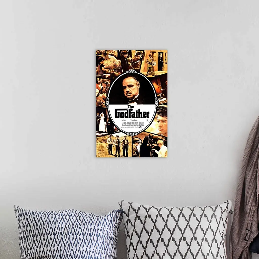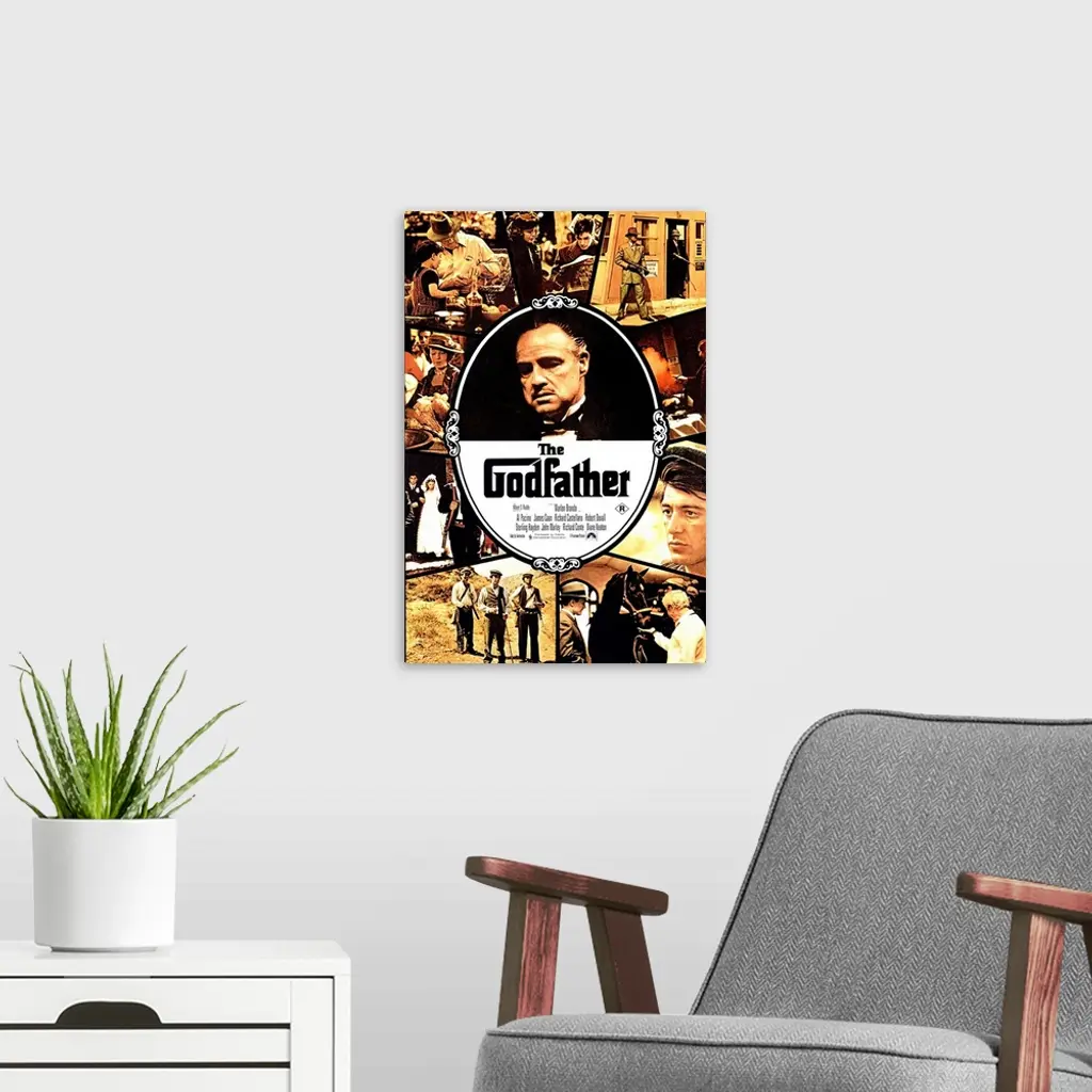 Movie poster for "The Godfather" that has Marlon Brando in the center of the poster with a collage of stills from the movie surrounding him.