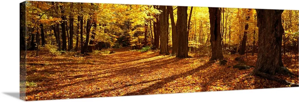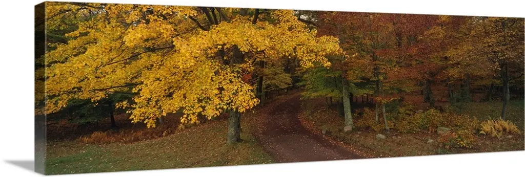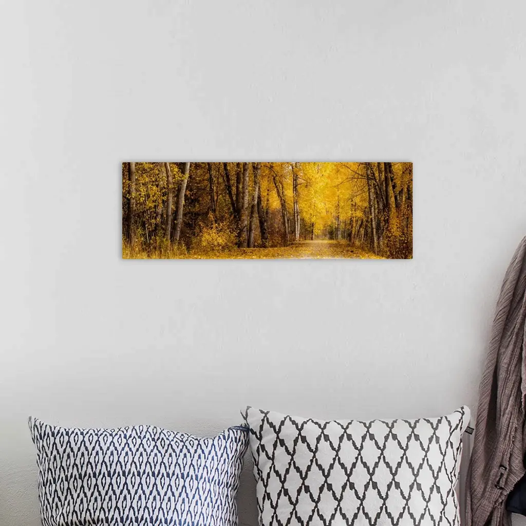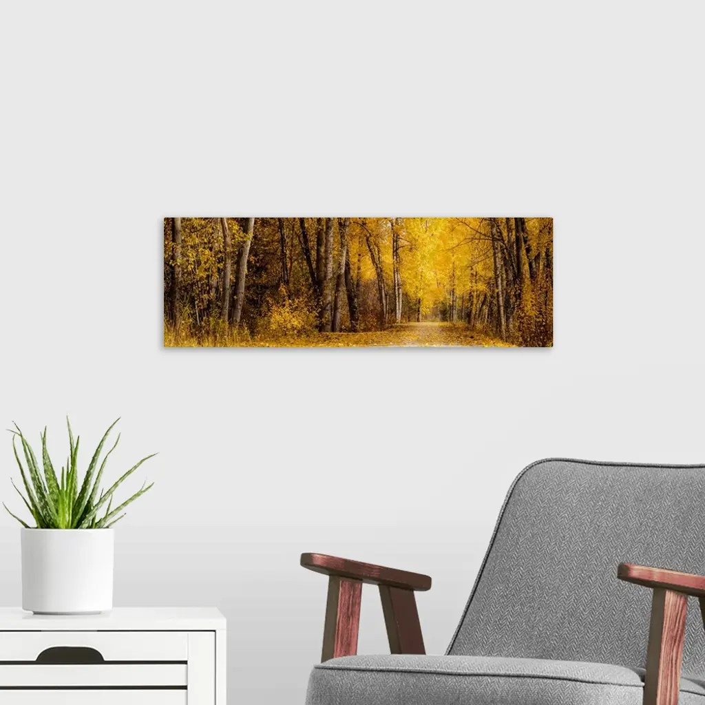 Trees line a pathway glowing in full autumn color.