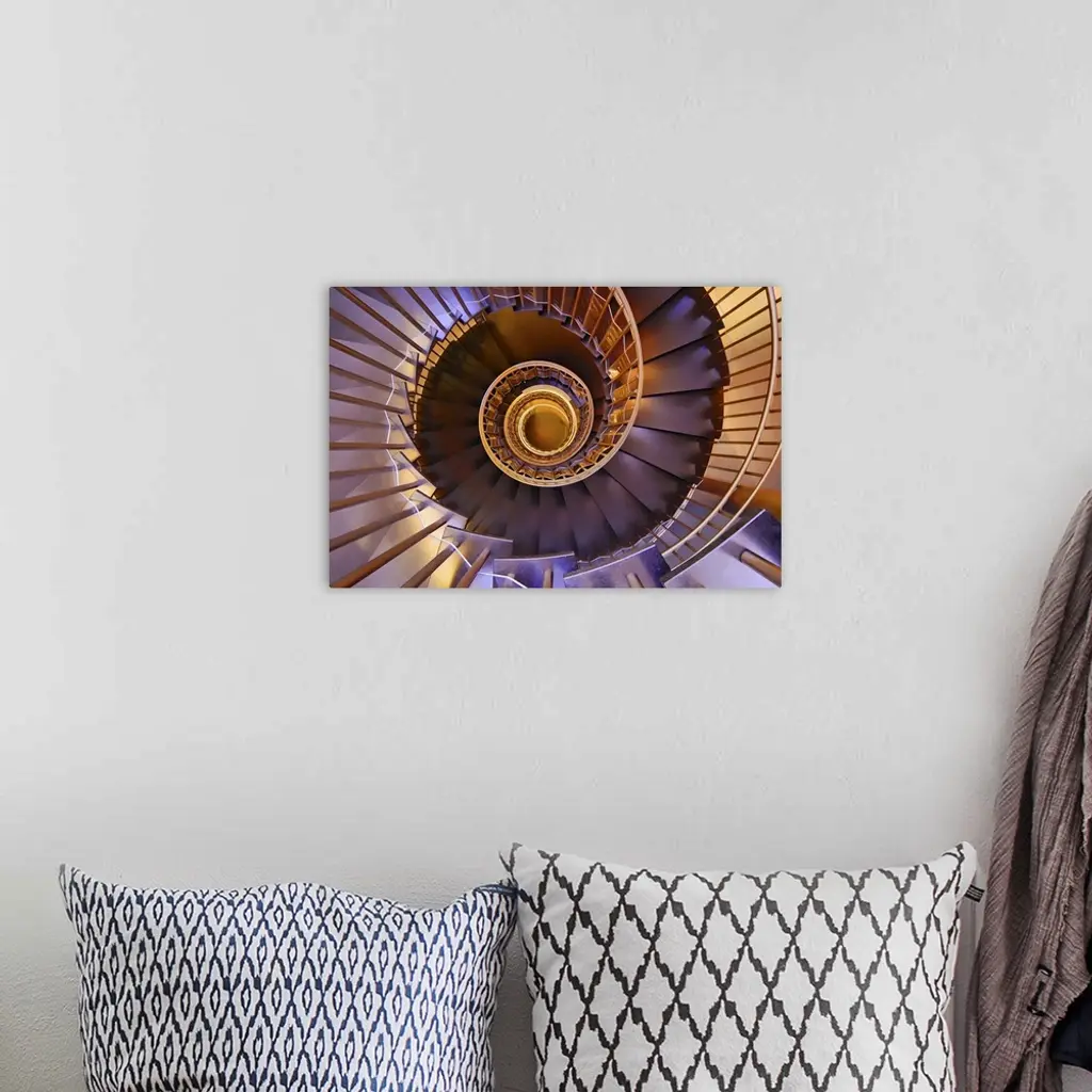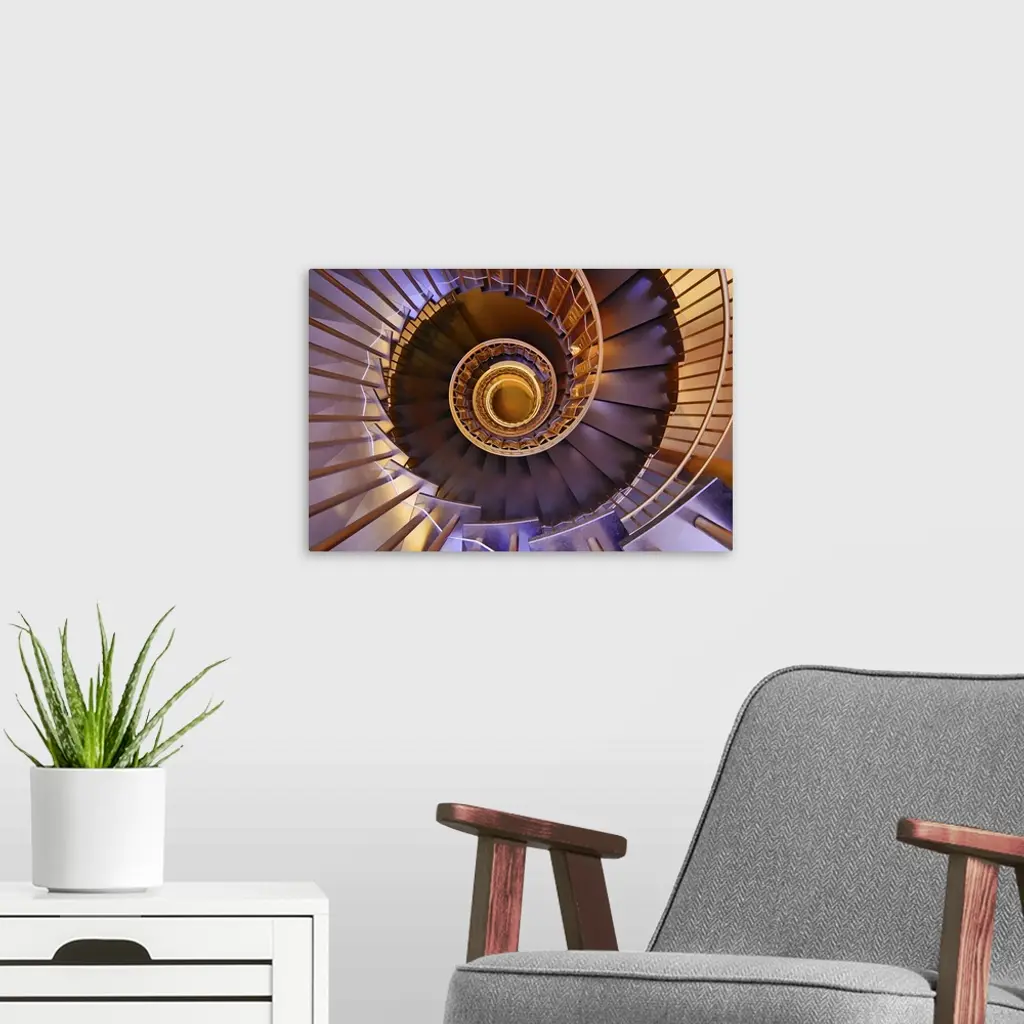 Looking down a spiral staircase with glowing yellow and purple lights.