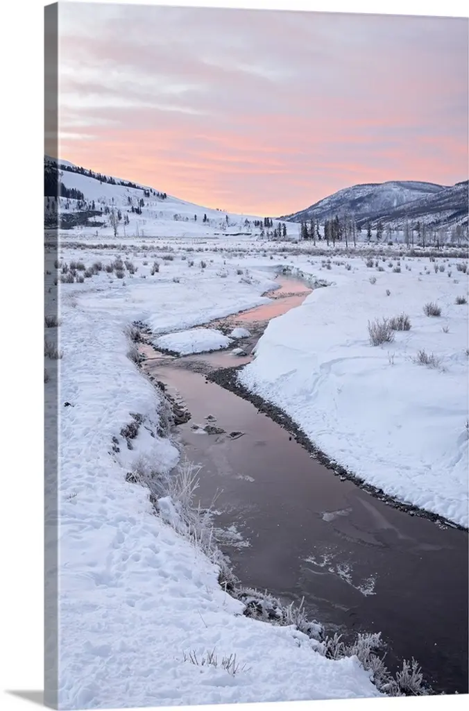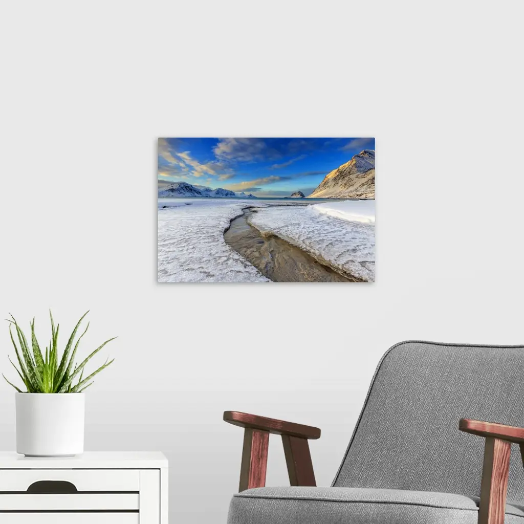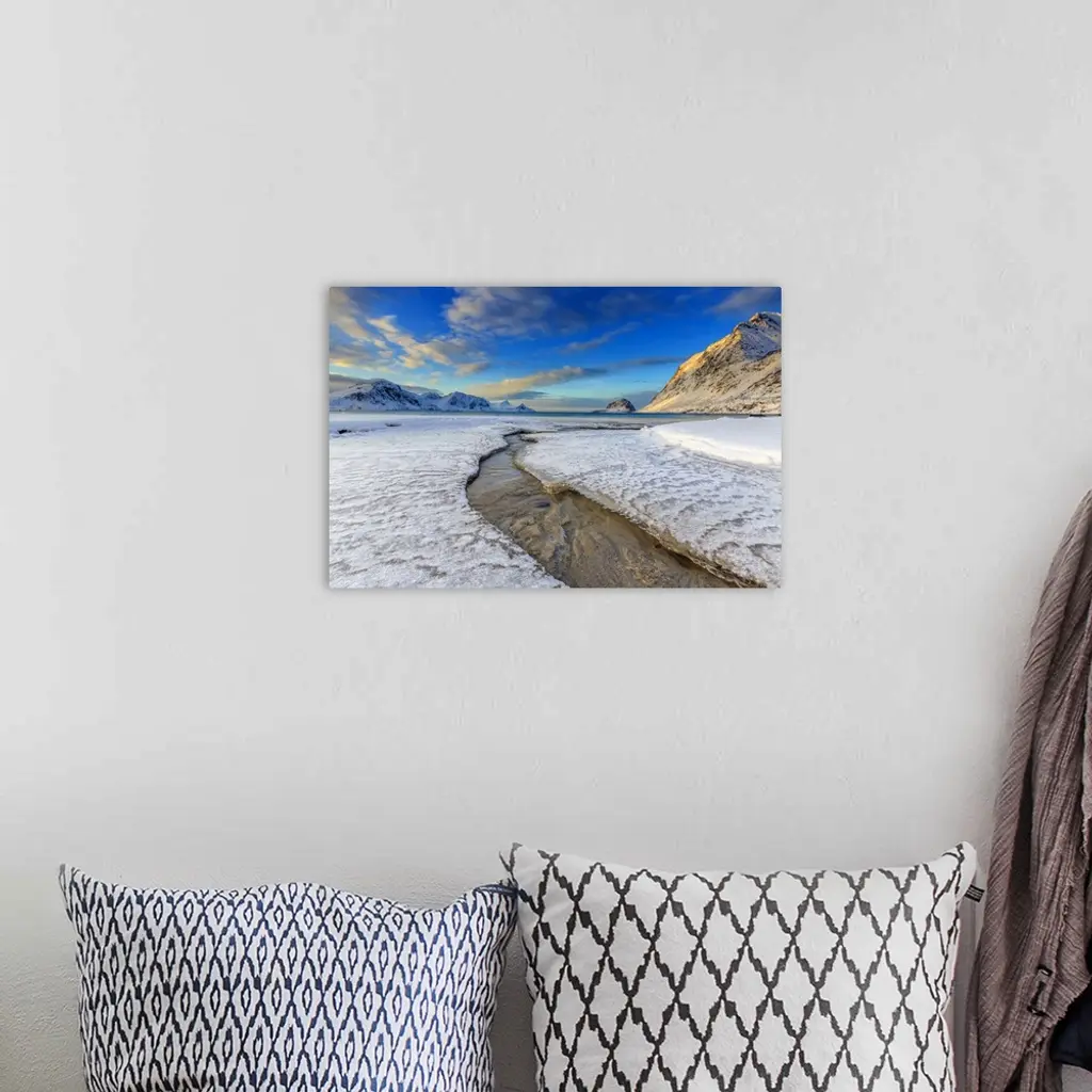 The golden sunrise reflected in a clear stream of the sea where the snow has melted, Haukland, Lofoten Islands, Arctic, Norway, Scandinavia, Europe