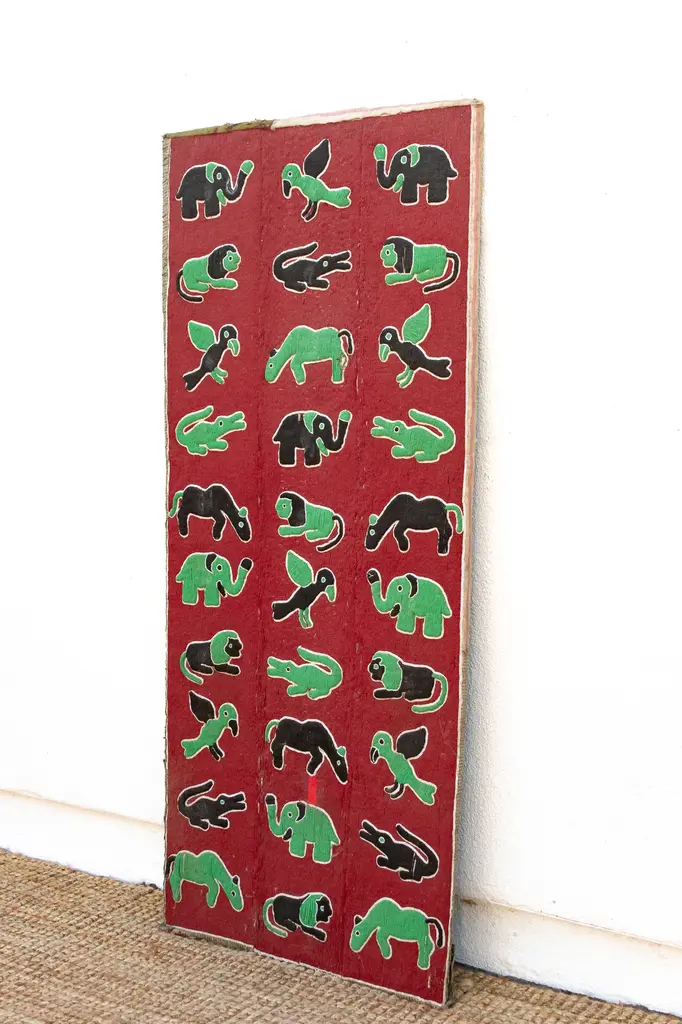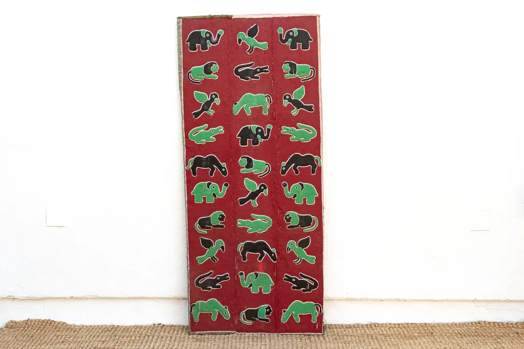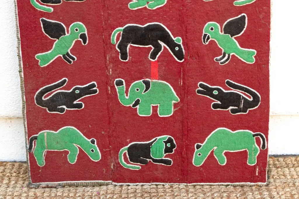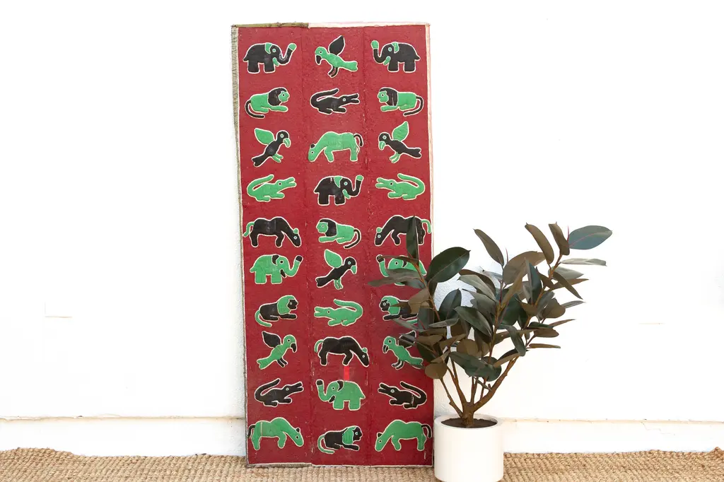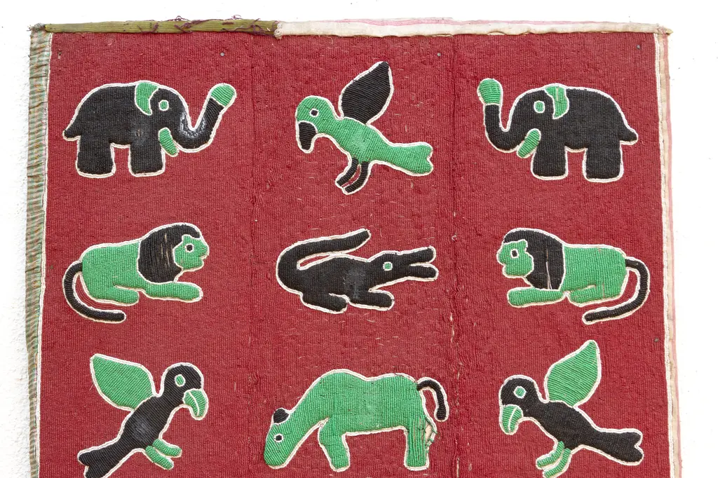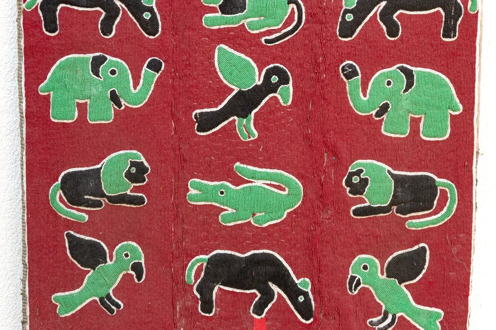 A grand tapestry of African wildlife: beaded wall panel. Embark on a visual safari with this magnificent beaded wall panel, a true masterpiece of African artistry. Standing tall at 6 feet, this impressive piece showcases a vibrant menagerie of creatures — elephants, birds, lions, crocodiles — meticulously rendered in colorful beads against a rich red backdrop. Has some age wear, blemishes and missing beads.