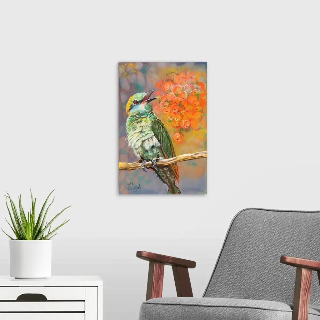 Bee-eaters are typically richly colored and this bird is no exception. Bright green plumage is particularly vibrant on the background of the bunch of red berries. But where are the bees?