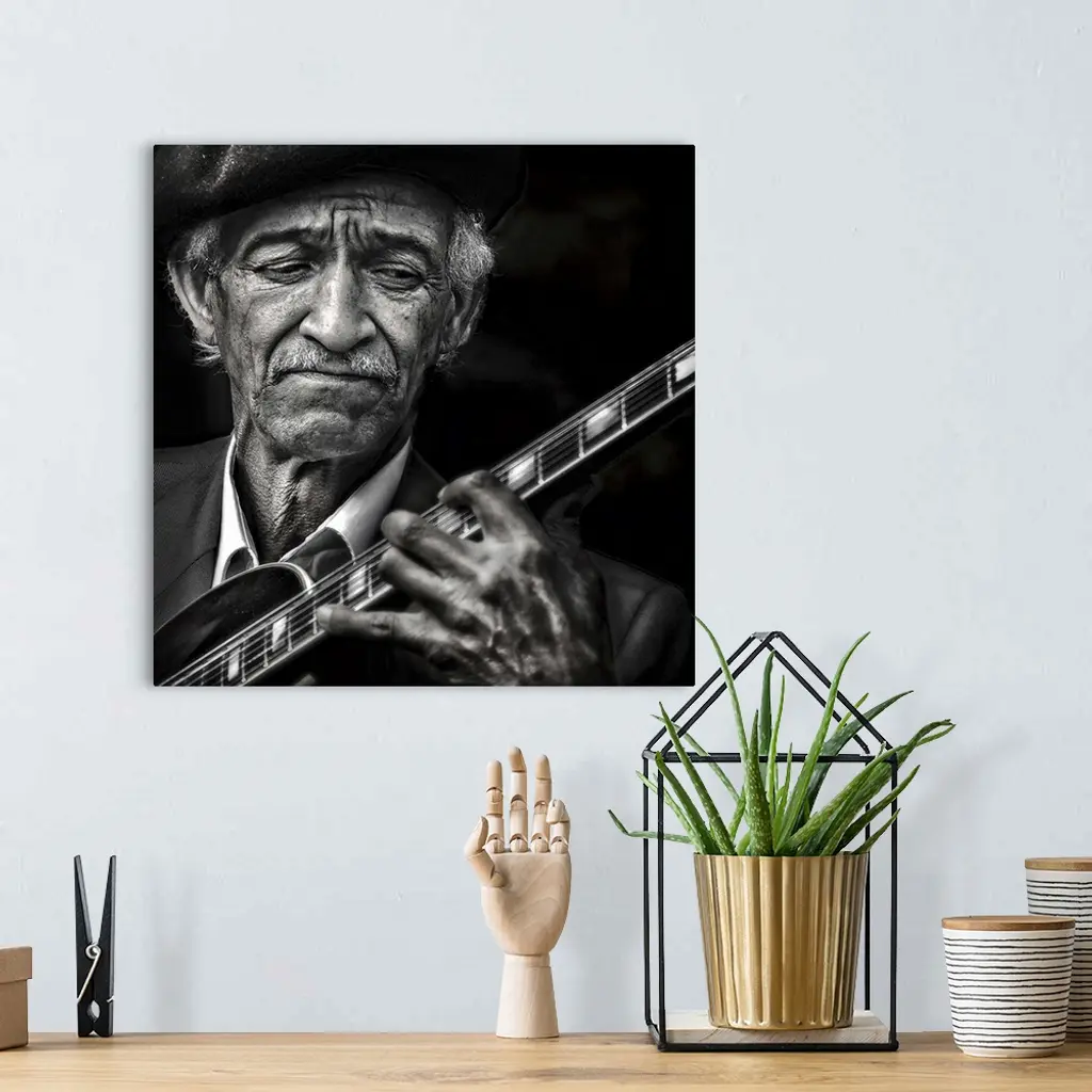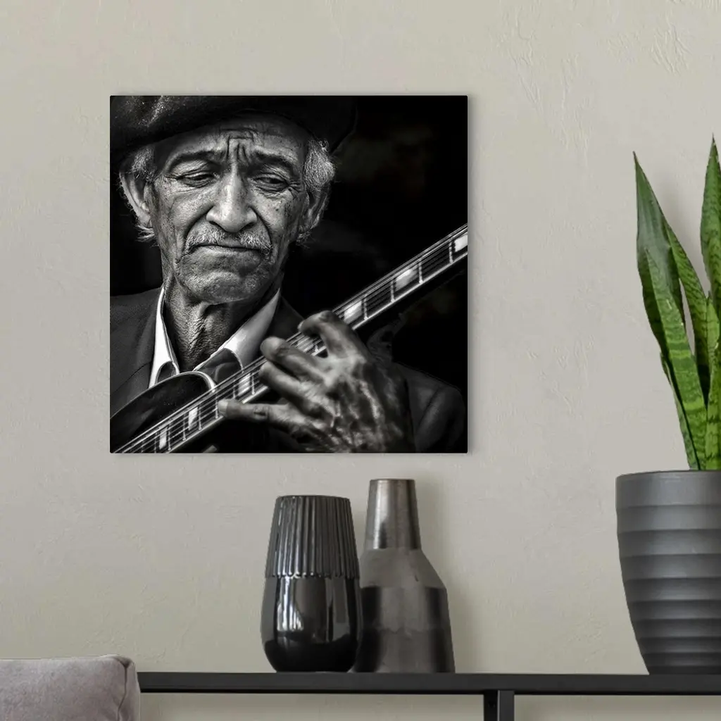 A man watches his fingers on the neck of the guitar has he plays a song.