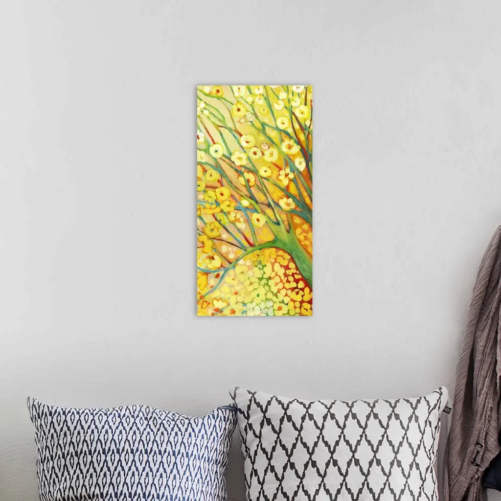 Budding yellow flowers sprout from tree branches and fall below on this vertical print.
