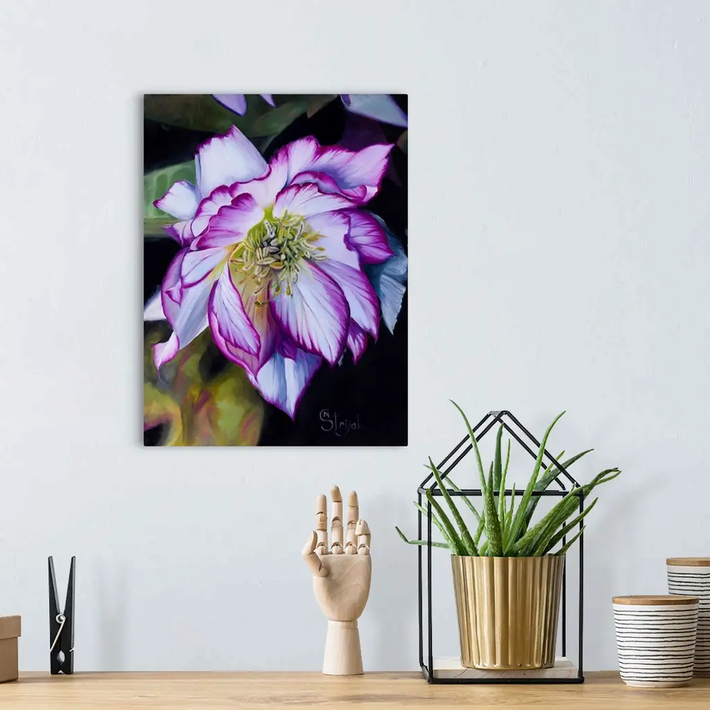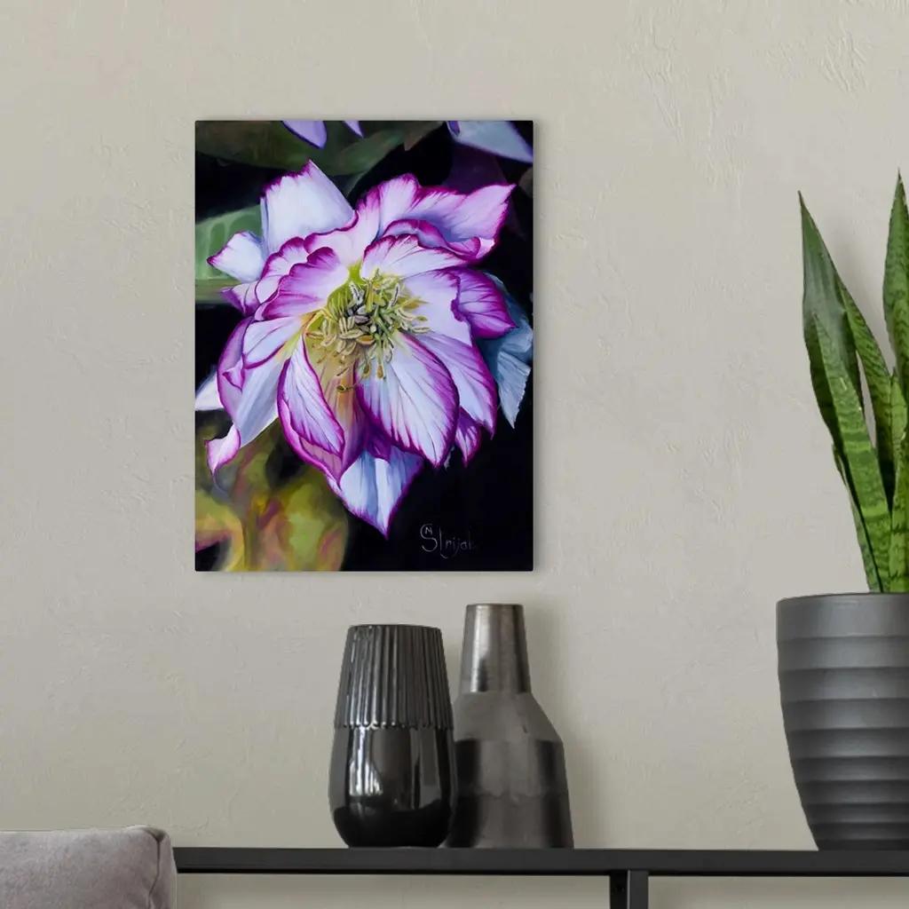 Gardeners treasure hellebores: unlike the majority of other flowers, hellebores' flowering period is winter and early spring. To add another trait, their sepals (not petals) do not fall but stay on the plant, often for months! The pink edge on the sepals of this hellebore is so intricate! Would you like to have a perfect flower, never withering or fading, in the comfort of your own home? Then this is the perfect piece of art for you.