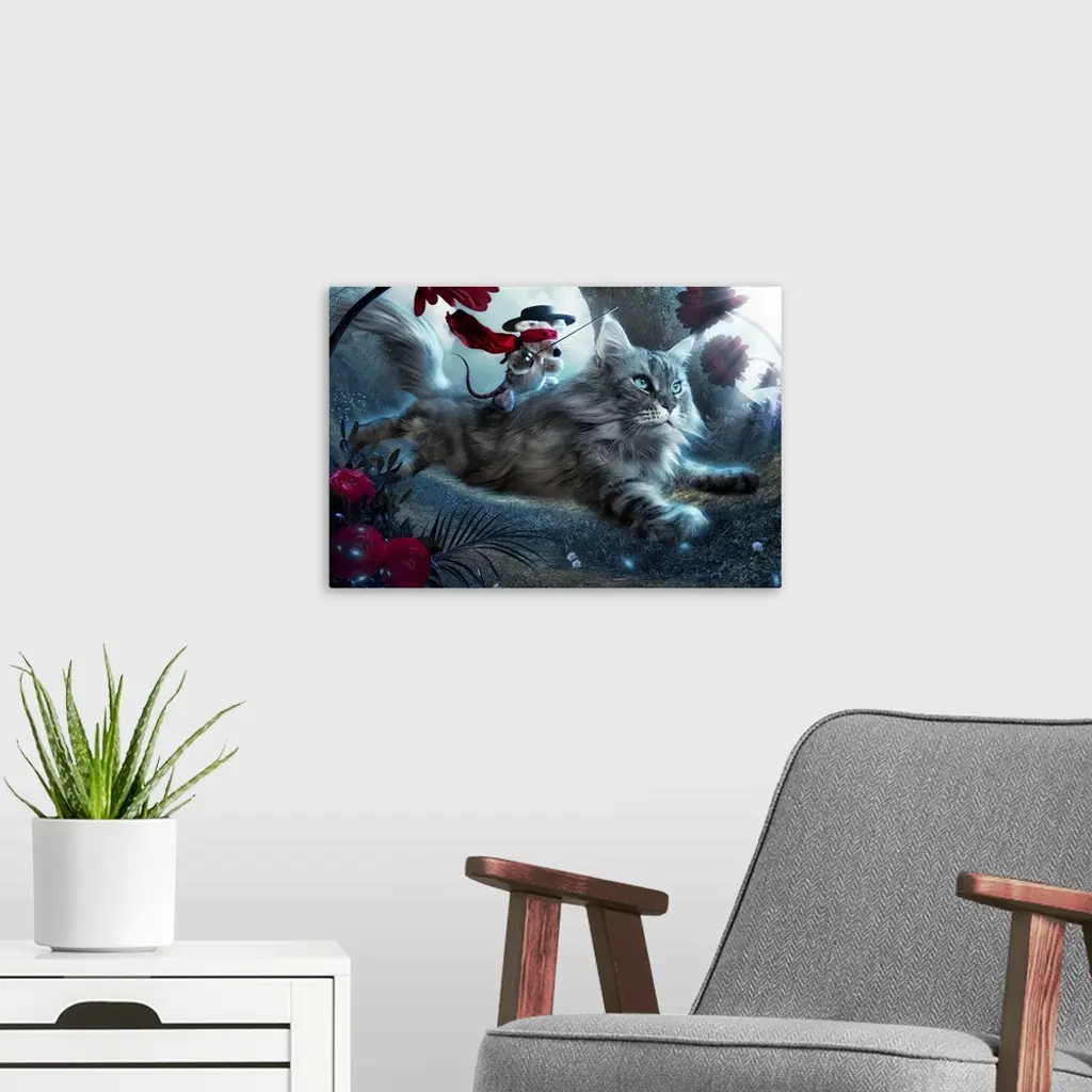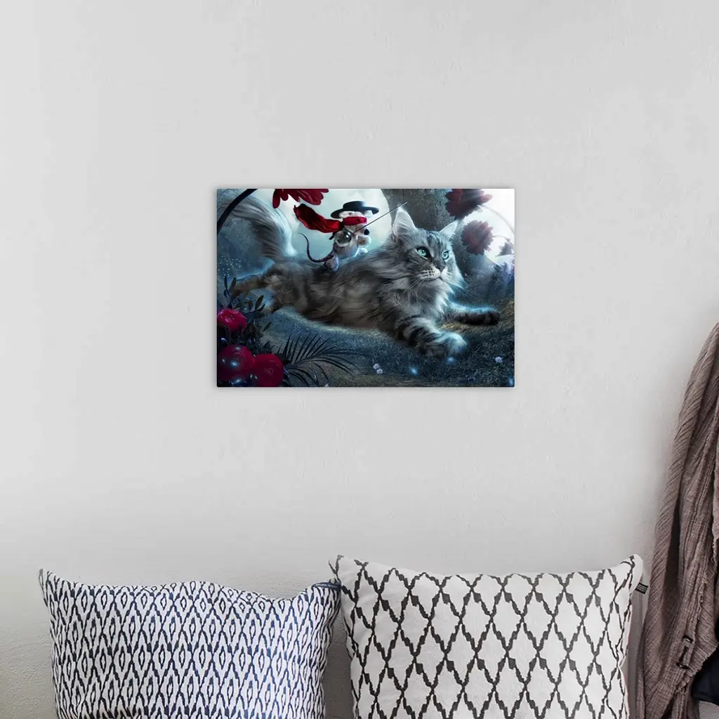 A plush mouse dressed like Zorro rides a cat through a forest.