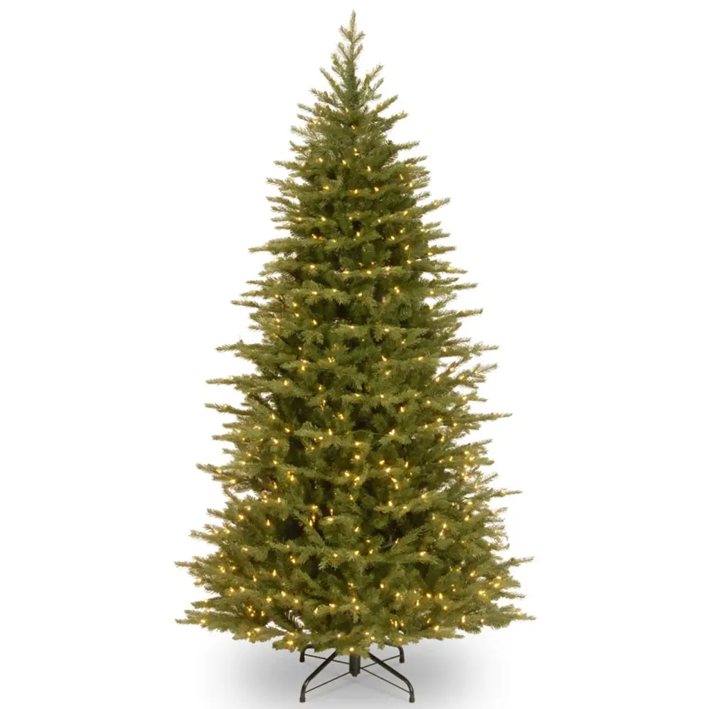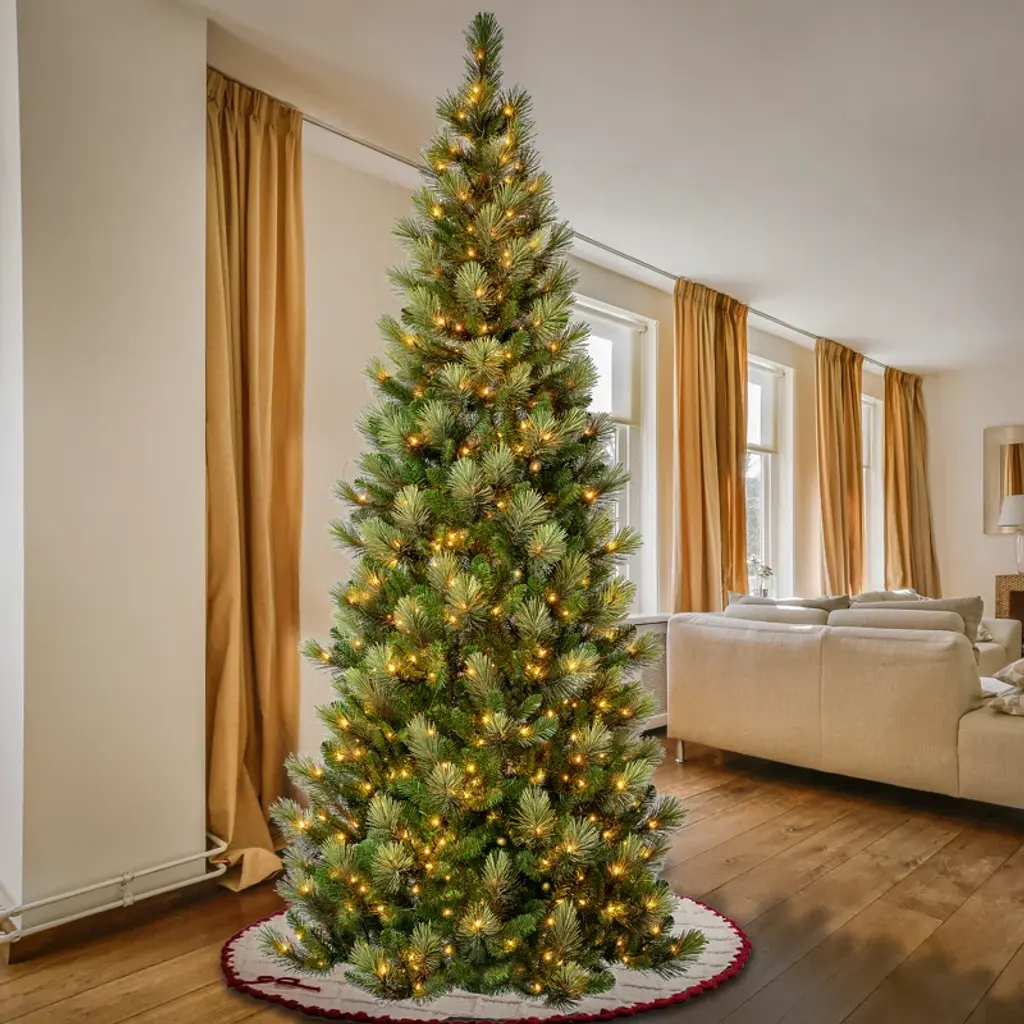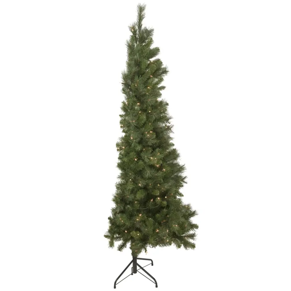 The Arcadia Pine Slim tree offers an extra thin profile making it a great choice for display in corners or in areas where floor space is limited. This tree features wide cashmere branch tips giving it a softer appearance. It is pre-strung with 150 clear lights that remain lit even if a bulb burns out. Two-section construction and hinged branches add to the ease of assembly. The sturdy folding metal tree stand is included.