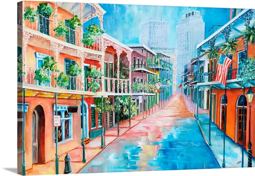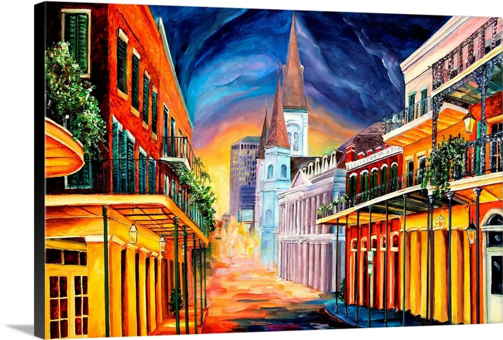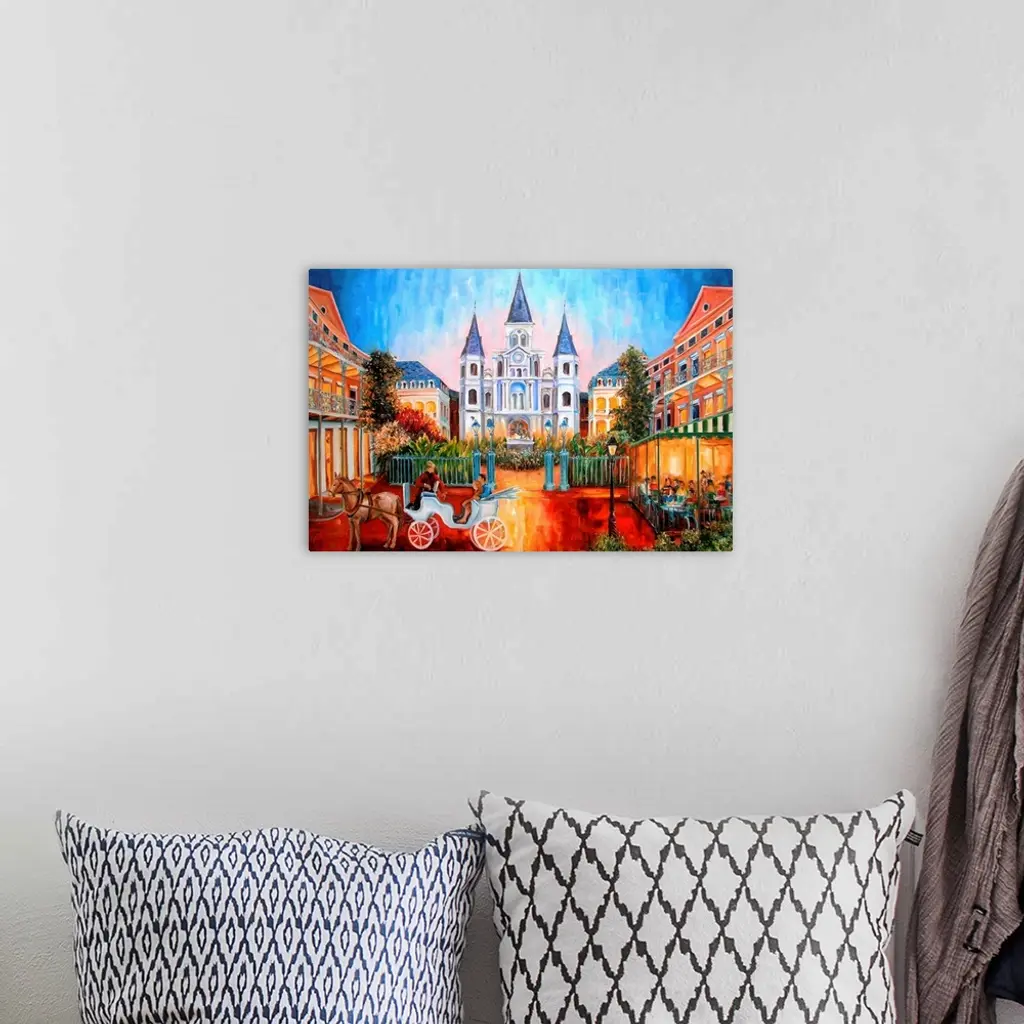Huge contemporary art shows a historic park in the French Quarter of New Orleans, Louisiana through the use of a lot of bright colors. Artist includes the St. Louis Cathedral in the background while also showcasing a couple enjoying a horse and carriage ride and a group of people sitting within a cafe in the foreground.