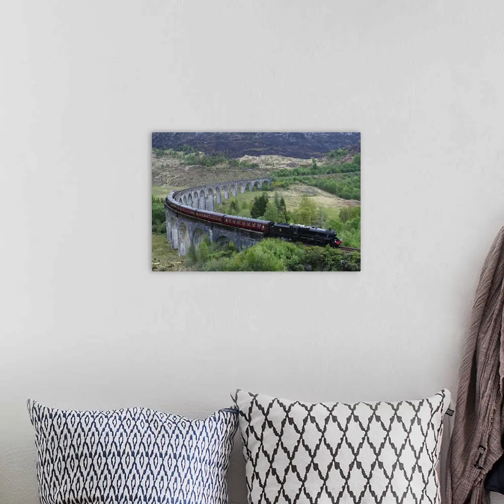 The Jacobite Express crossing Glenfinnan Viaduct, Mallaig, Highlands, Scotland, United Kingdom, Europe