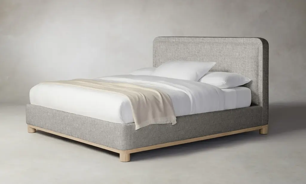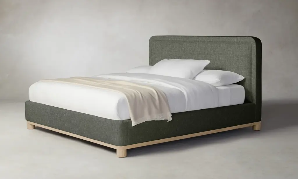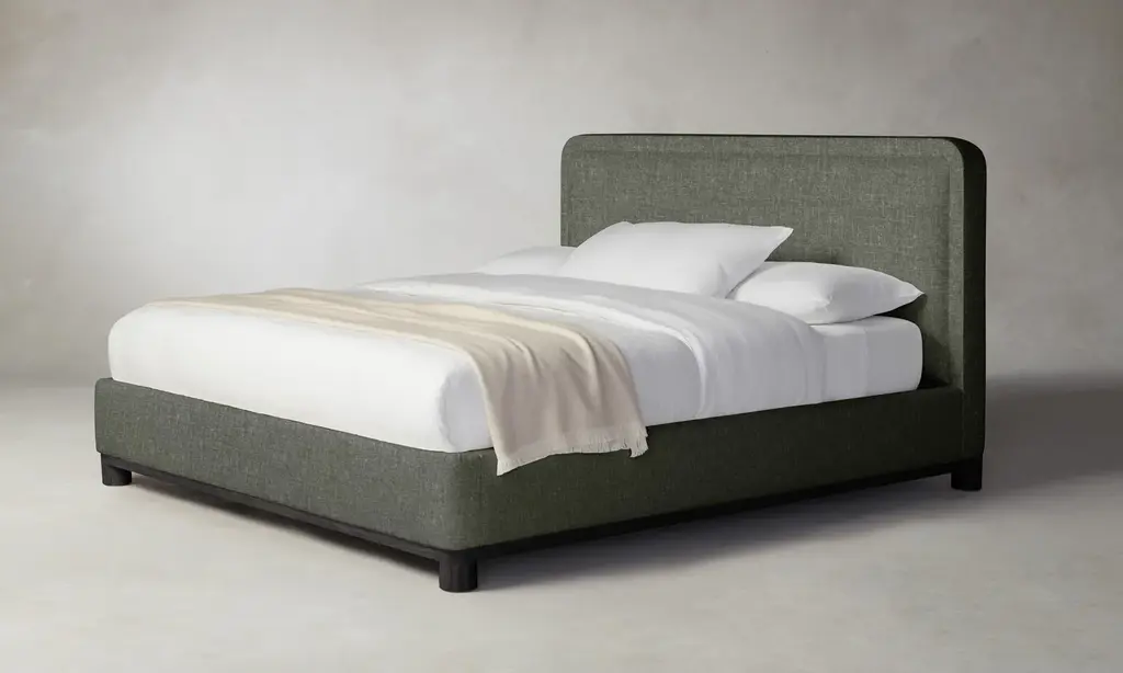The Kent Bed’s rounded geometries create a sense of softness and tranquility. The design is tightly upholstered to emphasize its curved corners and foot rail, and it sits atop a plinth base with lathe-turned legs. Handcrafted in North Carolina.
