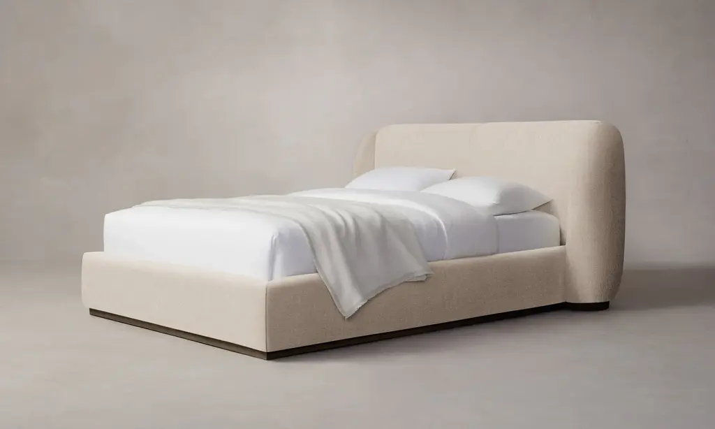 The Kent Bed’s rounded geometries create a sense of softness and tranquility. The design is tightly upholstered to emphasize its curved corners and foot rail, and it sits atop a plinth base with lathe-turned legs. Handcrafted in North Carolina.