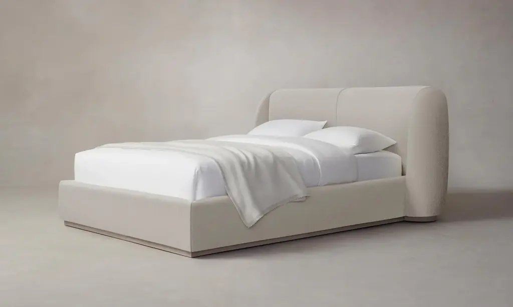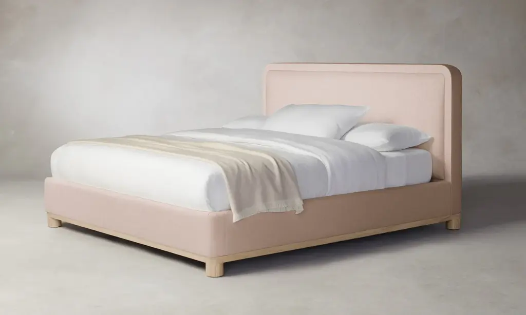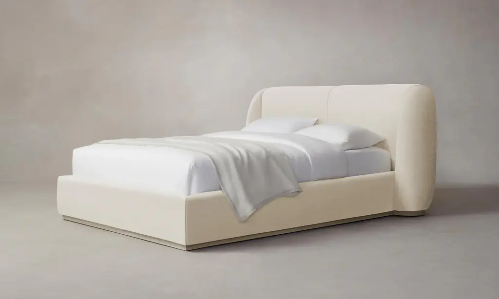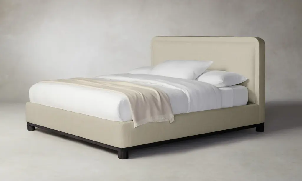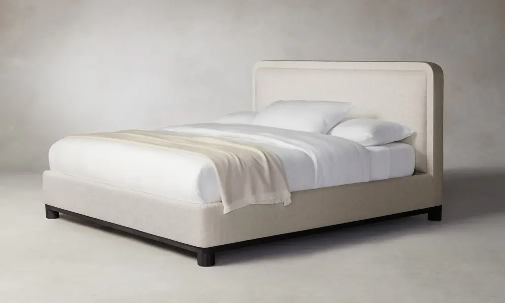 The Kent Bed’s rounded geometries create a sense of softness and tranquility. The design is tightly upholstered to emphasize its curved corners and foot rail, and it sits atop a plinth base with lathe-turned legs. Handcrafted in North Carolina.