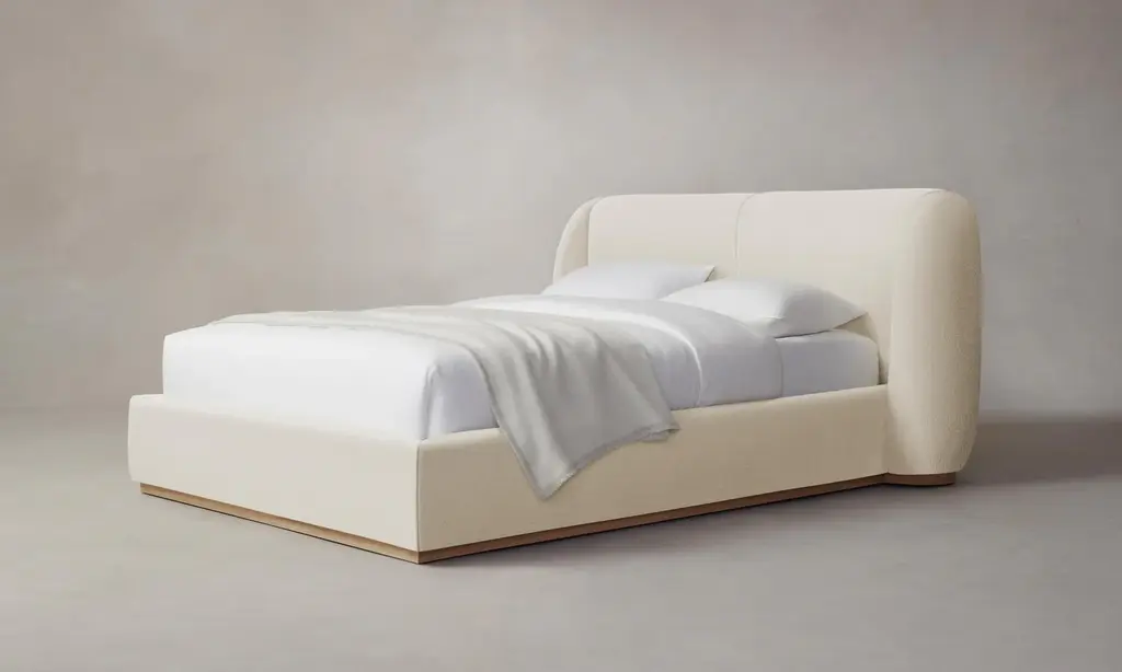 The Kent Bed’s rounded geometries create a sense of softness and tranquility. The design is tightly upholstered to emphasize its curved corners and foot rail, and it sits atop a plinth base with lathe-turned legs. Handcrafted in North Carolina.