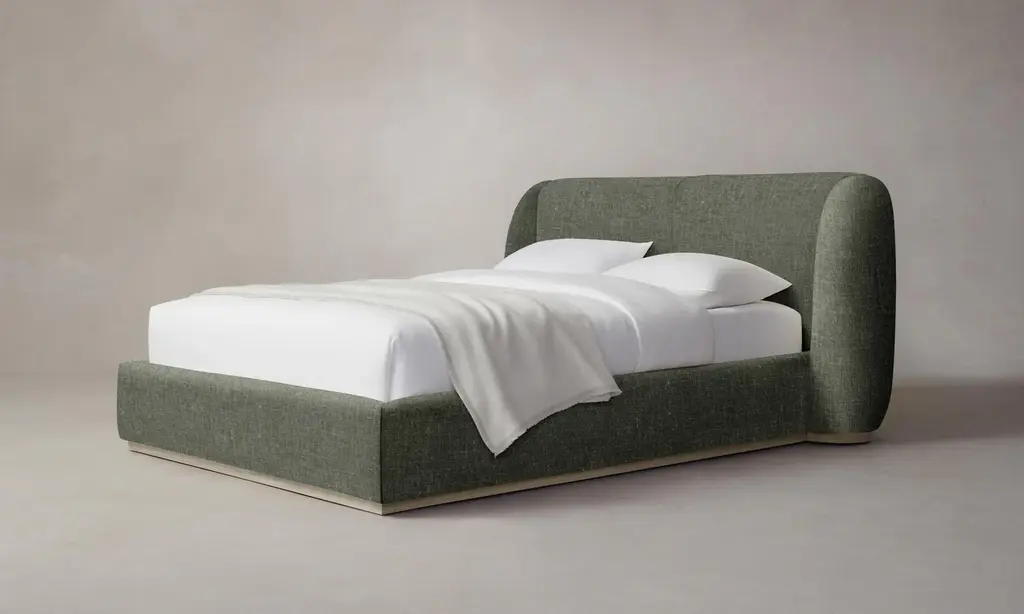 The Kent Bed’s rounded geometries create a sense of softness and tranquility. The design is tightly upholstered to emphasize its curved corners and foot rail, and it sits atop a plinth base with lathe-turned legs. Handcrafted in North Carolina.