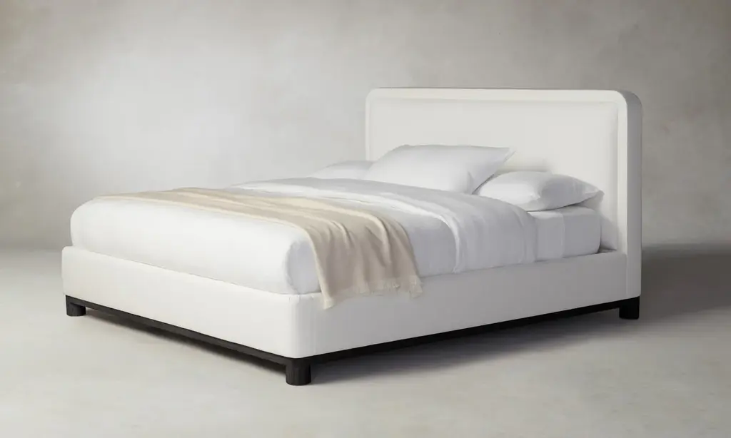 The Kent Bed’s rounded geometries create a sense of softness and tranquility. The design is tightly upholstered to emphasize its curved corners and foot rail, and it sits atop a plinth base with lathe-turned legs. Handcrafted in North Carolina.