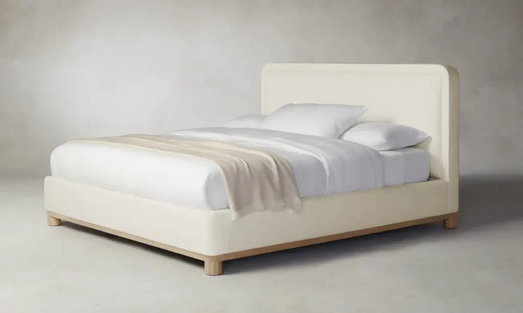 The Kent Bed’s rounded geometries create a sense of softness and tranquility. The design is tightly upholstered to emphasize its curved corners and foot rail, and it sits atop a plinth base with lathe-turned legs. Handcrafted in North Carolina.