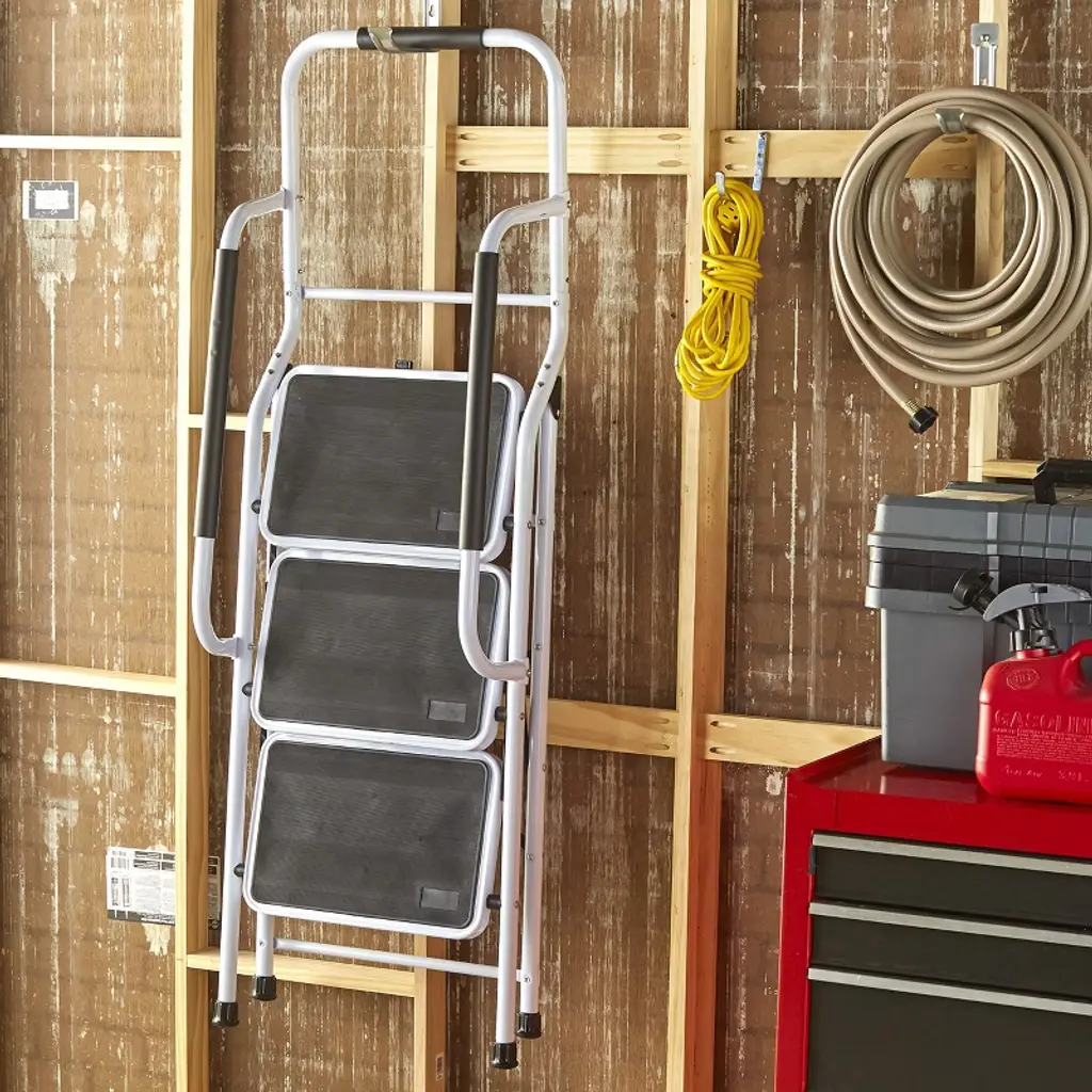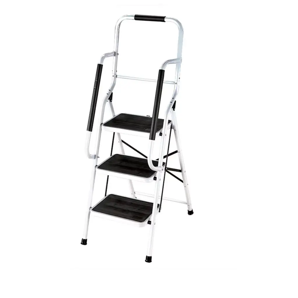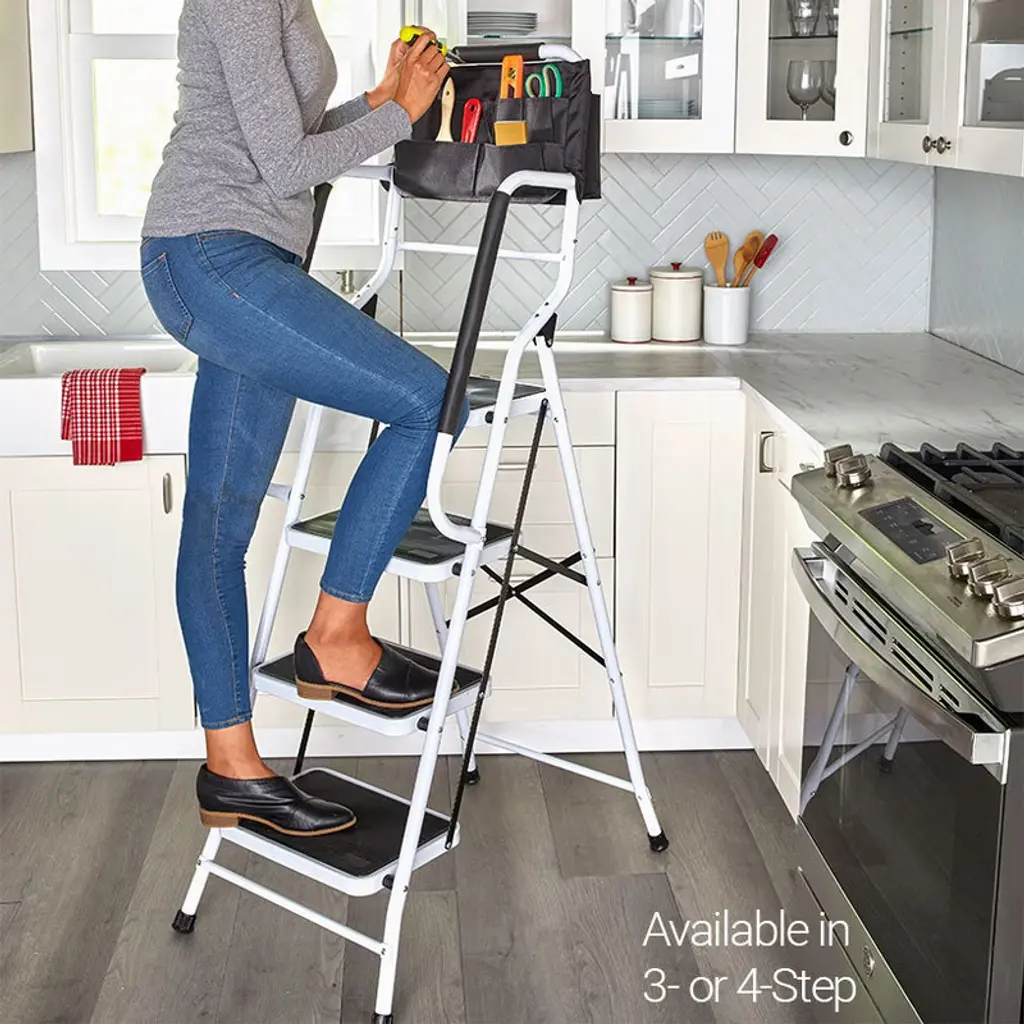 Safely get up to those hard-to-reach places for cleaning, decorating or retrieving items with this project ladder that has 3 steps and folds for compact storage. It features foam padded handrails, extra wide steps with nonslip treads and padded feet that won't scratch floors. The space saving design folds flat for easy transport and storage when not in use. Steel. 18"W x 27-1/2"D x 43"H