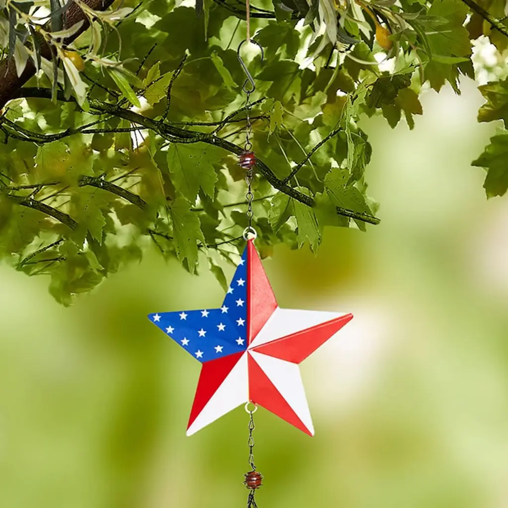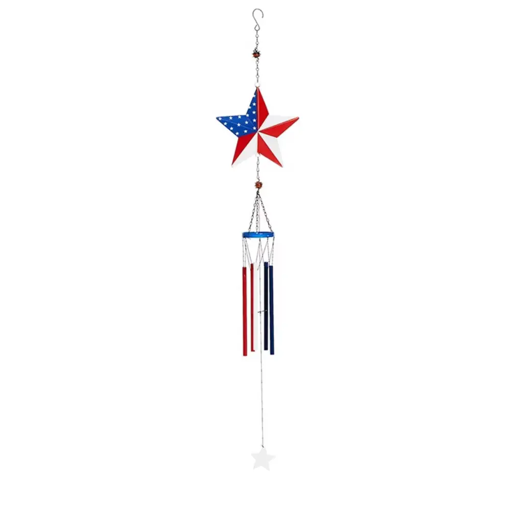 Americana Windchime brings beautiful music and national pride to your patio, porch or deck. Red and blue chimes hang from a red, white and blue star. They perform a tinkling melody when the breeze blows. Made of: Metal Measurements: 7-1/2"W x 3"Dx 40-1/8"H