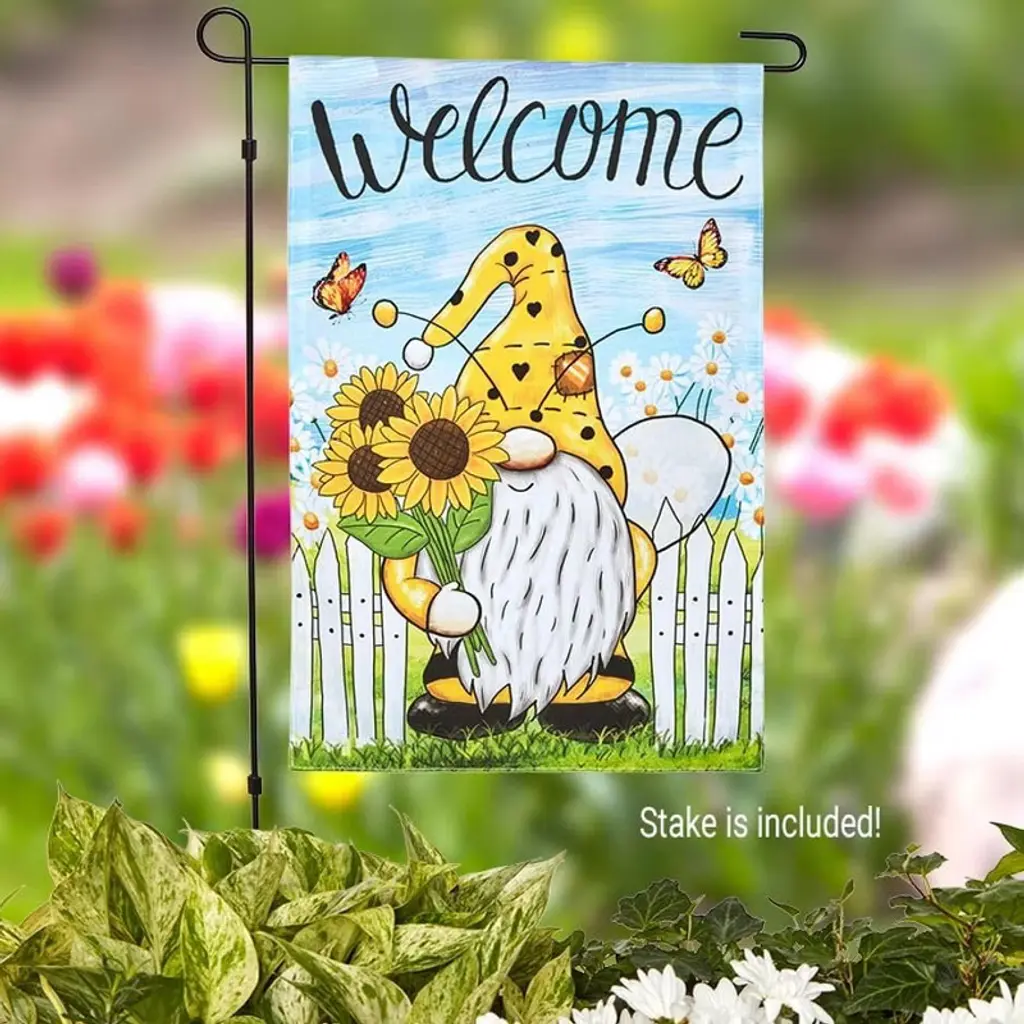 Bee Gnome Welcome Garden Flag with Metal Pole is a colorful way to greet everyone who passes by your yard. Printed on both sides, the cheery design features a gnome dressed as a bumblebee, sunflowers and butterflies. Includes flag pole for display. Made of: Flag, polyester Pole, iron Measurments: Flag, 12"W x 18"L Pole, 15-1/2"W x 37-3/4"L