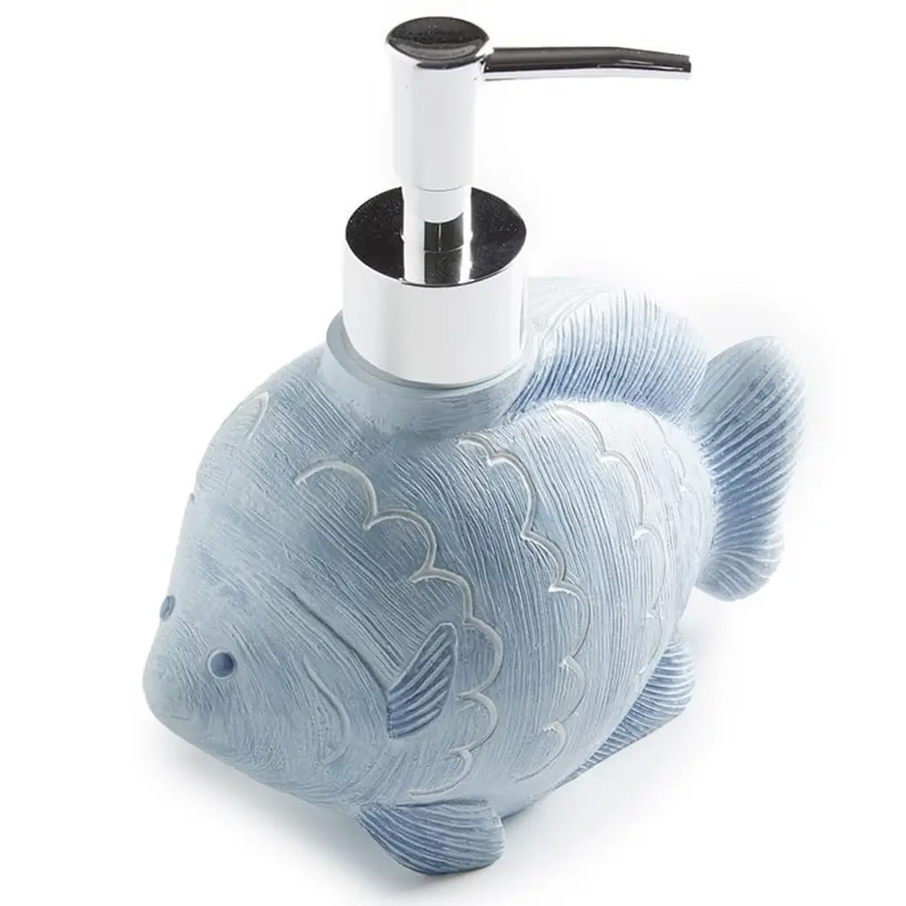 The soap/lotion pump is designed to look like a blue fish. The fish’s body is textured with scales and fins, and it has a small blue eye detail. The pump mechanism, which is silver, is located on the top of the fish’s back, making the fish’s body the container for the soap or lotion. This pump combines functionality with a fun, decorative design, making it a charming addition to a bathroom or kitchen.