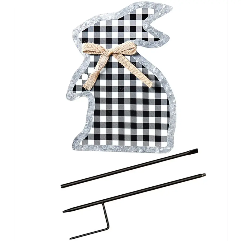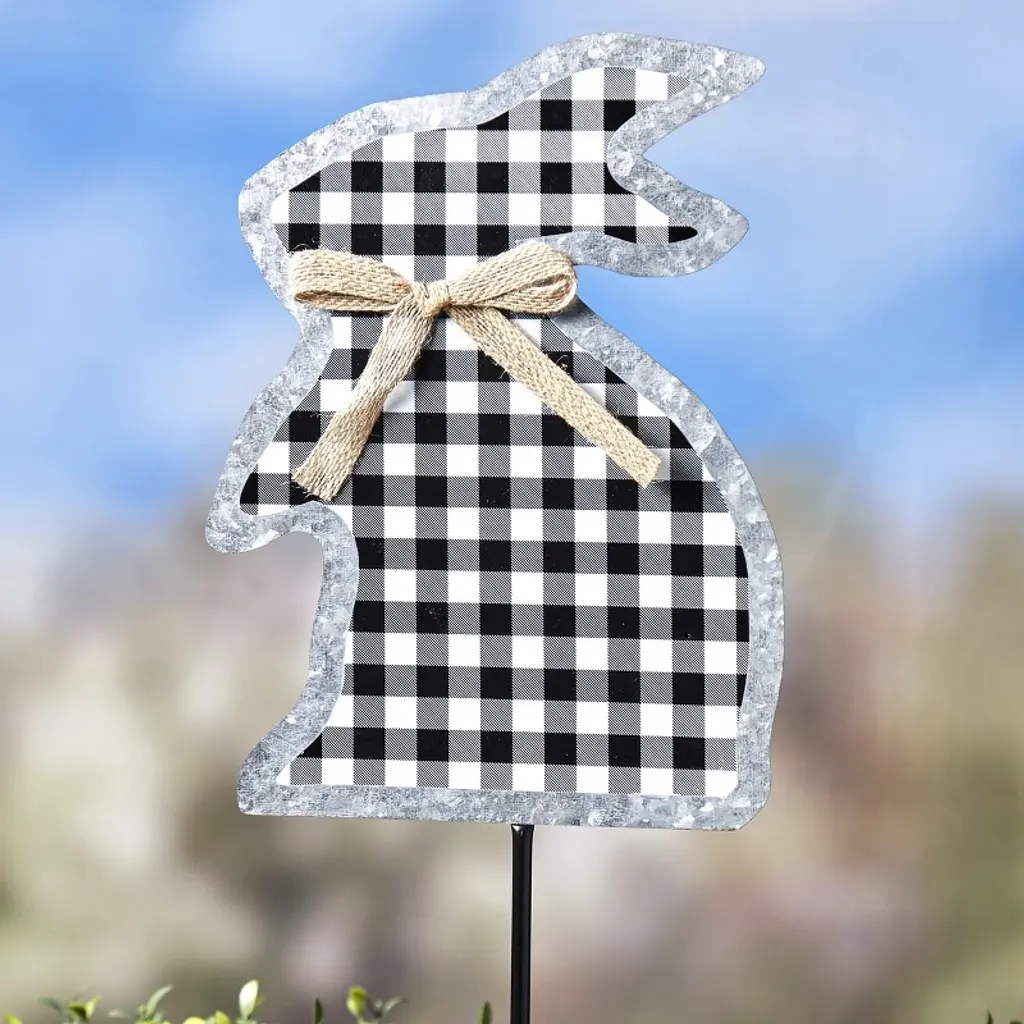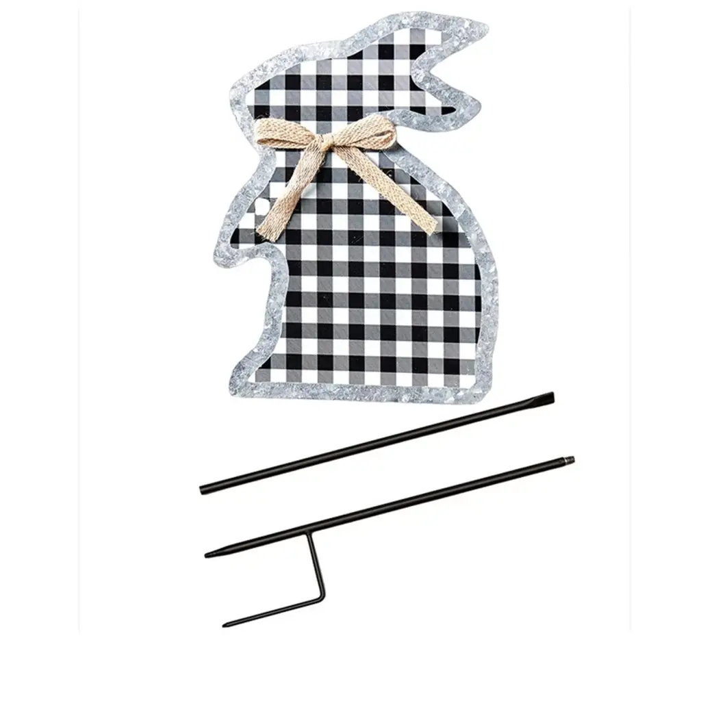 Decorate your yard for spring in country style with this bunny stake. Each bunny features a pattern of black and white checks within a galvanized metal frame and a burlap bow tied around its neck. You can place it anywhere in the yard for a simple farmhouse accent. Put it in the front lawn landscaping, the backyard flowerbed, or the entryway sidewalk. They are made of metal and will last for seasons to come. Metal. Assembly required; hardware included. 16-1/2”W x 1/2”D x 37-3/4H”, including the 4” ground stake, each.