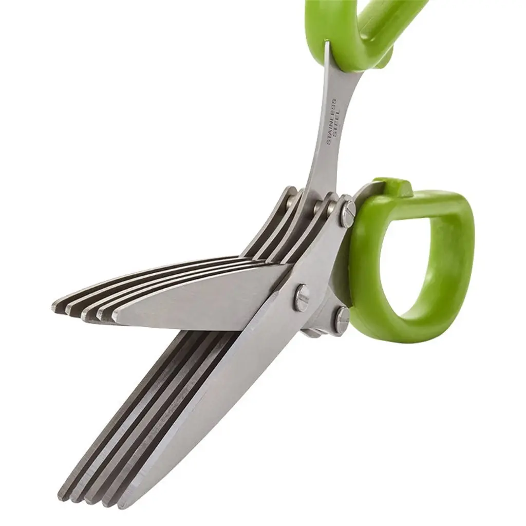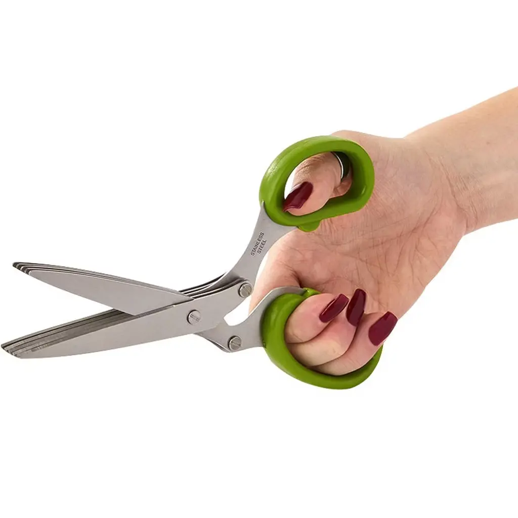 Herb Scissors are the simple way to prep your seasonings. 5 sets of blades chop up fresh basil, cilantro, parsley and more in fewer strokes than a knife, saving you time and effort. They are a must for anyone who loves the superior flavor of fresh herbs. Made of: Stainless steel and plastic Measurements: 4-1/2"W x 4-1/2"D x 10-7/8"H Notes: Hand wash only