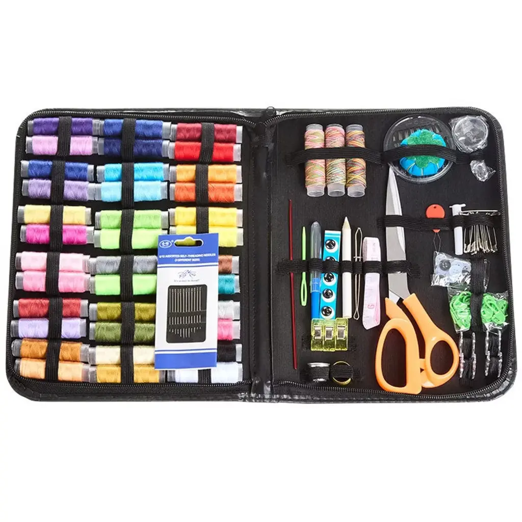 You'll always be ready for quick fix and craft projects with our Household Sewing Craft Set. Unzip the slim case, and you'll find everything you need to repair broken snaps, lost buttons and more. In addition, the set has tools you'll need for larger projects when it's time to get creative. Includes a rainbow of thread so you'll always have the color you need. Fits easily in a drawer so it is always handy, and straps keep everything in place. Made of: Polyester, plastic and metal Measurements: 7-5/8"W x 10-1/4"L x 1-1/2"H Set includes: Scissors Buttons Safety pins Pin cushion 36 Spools of solid-color thread 3 Spools of veriegated thread Crochet hook Sewing needles Needle threader Straight pins Tapestry needle Snaps 2 Thimbles Seam ripper Stitch markers 4 Bobbins Tape measure Fabric pencil Mini clips