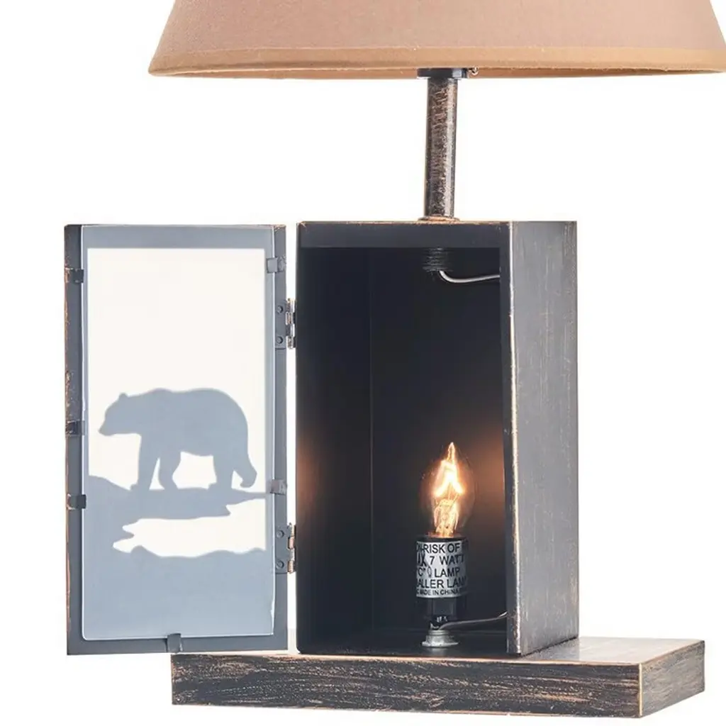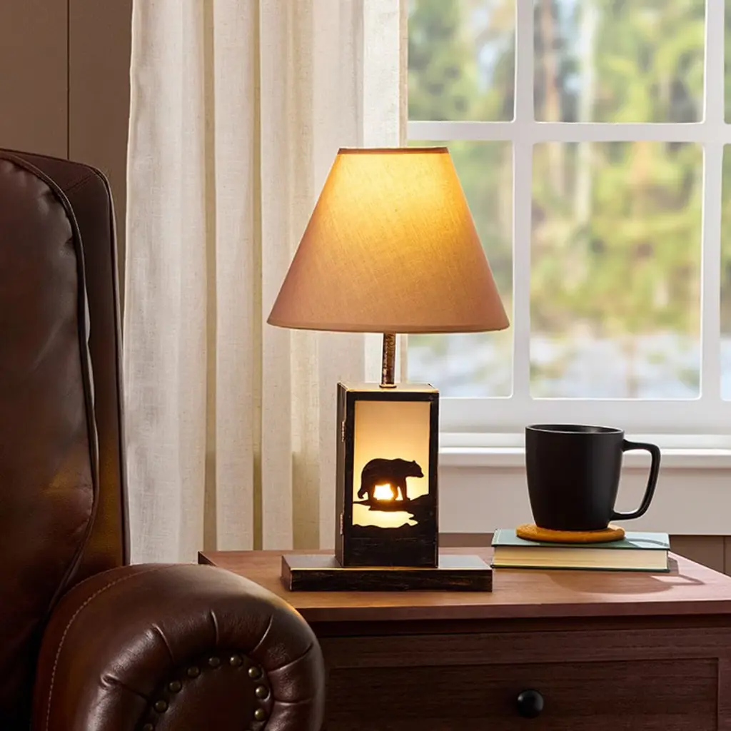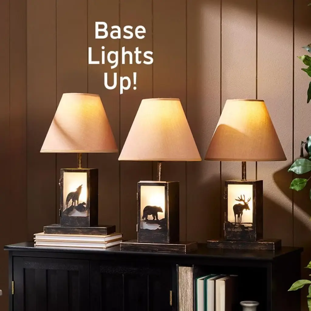 Into the Woods Lamp is more than just a practical light. It also is a beautiful accent. The base has a iconic animal silhouetted against a faux sunset. Dark trim goes wonderfully with other pieces of lodge decor. Made of: Metal, polyester and PVC Measurements: 9" dia. x 16-1/4"H Notes: Main lamp requires 40-watt bulb Base requires a C7 bulb