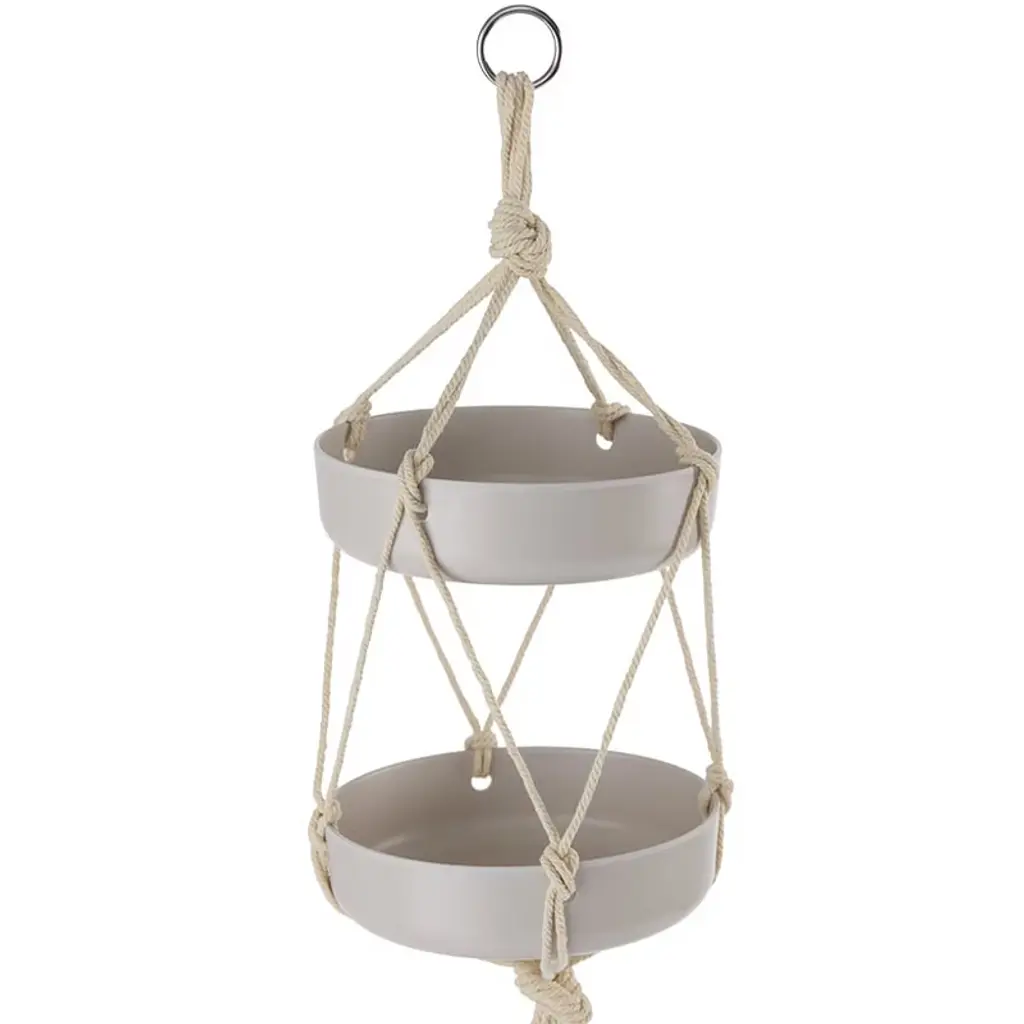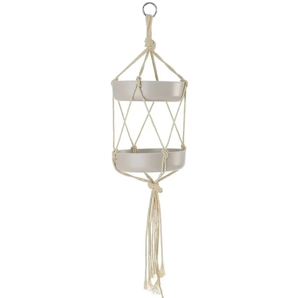 Double-tiered Macrame Bird Feeder and Waterer is a full-service stop for your feathered friends! The upper-level tray holds refreshing water while the and lower-level food tray provides food. The lower tray has drainage holes to help keep the birdseed fresh. With birds perching on the trays themselves, it's like having a ringside seat to your own wildlife show'don't forget to grab your camera! The feeder hangs effortlessly from a strong metal loop, making setup a breeze. Whether you're a seasoned bird watcher or just beginning your birding adventure, this feeder is perfect for creating a welcoming haven for your feathered friends. Made of: Cotton and plastic Measurements: 6-1/2" dia. x 24"H
