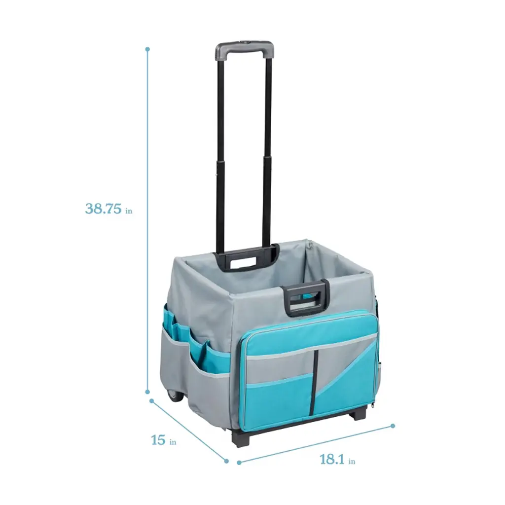 This Rolling Sewing Machine Tote makes it easy to transport your supplies from place to place. Its large size even allows you to store smaller projects with your necessities. The exterior features 1 front pocket and 2 side pockets with fabric-magic closures. Its interior features 3 clear zipper pockets inside the lid and fabric-magic straps that keep your machine in place. Move it around using the expandable handle or the double handles on top.