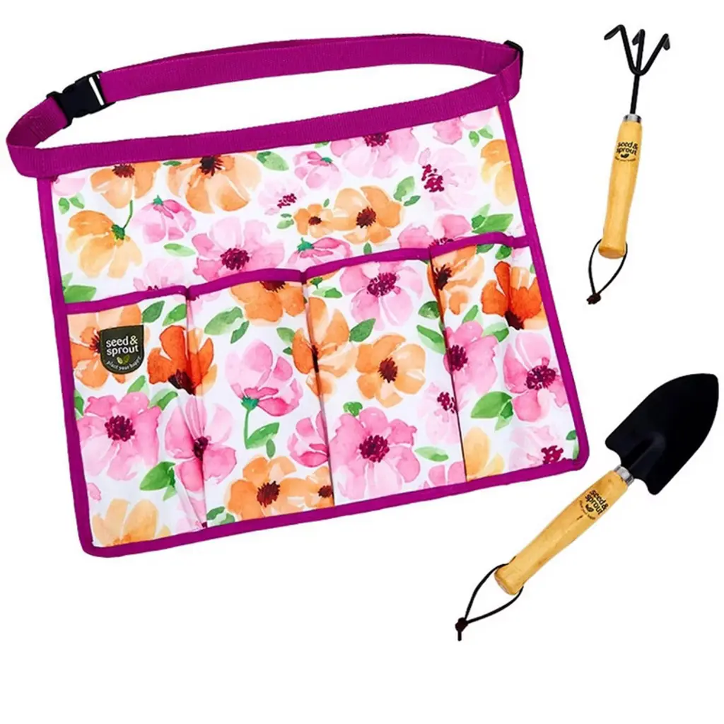 Seed Sprout Gardening Set has the tools you need to start your garden. Work apron with 4 pockets helps you carry in the included hand tools, as well as other tools, seeds and more. Made of: Polyester, iron, PVC and wood Set includes: -Adjustable apron, 15"W x 14"L -Hand shovel, 9-1/2"L -Hand rake, 9"L Care: Apron, hand wash and hang to dry Notes: Imported