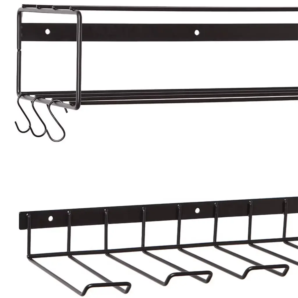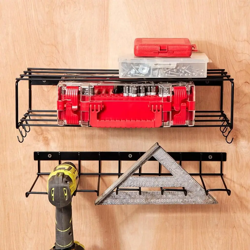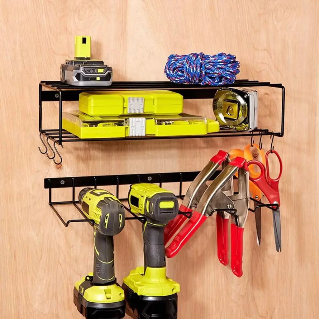 Our Set of 2 Tool Holder Racks saves space in your garage, shed or workshop. These 2 racks can be installed together or in different places for extra versatility. Use the top rack to organize bit sets, battery packs, screwdrivers and more. The bottom section has 4 slots for power tools. The 6 hooks offer space for power cords and more. Made of: Steel Measurements: Top section, 16-7/8"W x 7-3/8"D x 3-7/8"H Bottom section, 16-7/8"W x 7-1/8"D x 2-1/8"H Notes: Hanging hardware included