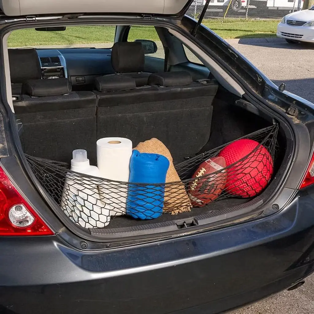 The Trunk Cargo Net is your new best friend for hassle-free car organization, designed to make your life easier and your journeys smoother. Whether you're securing a stack of groceries or keeping your playful pup safely in the back, this versatile net has you covered, simplifying all your storage challenges. With its foldable and lightweight design, it's easy to bring along on any adventure, ensuring that you're always prepared. Use it as a storage organizer to prevent your gear from tumbling during sharp turns, providing unparalleled peace of mind and safety. Alternatively, employ it as a protective barrier to keep your trunk tidy and clutter-free, enhancing the cleanliness and order of your vehicle. Installation is a breeze; simply attach it to your car's handle or front seat headrest using the included hooks and elastic bungee cords'a process so simple you'll have it up in minutes. This adaptable net effortlessly fits most vehicles, meaning cars, SUVs, and trucks can all benefit from its clever design, offering flexibility for various needs. As you gear up for your next road trip, load your car with confidence, knowing everything will stay in place with the reliable Trunk Cargo Net. It's a small investment for a big difference in your driving experience, committed to keeping you organized wherever the road takes you. It's like having an extra pair of hands in the back to help. Its durable and reliable construction ensures long-lasting use, making it a must-have accessory for any car owner. Key Features:Versatile use for securing packages or petsLightweight and easy to transportSimple installation with included hooks and bungeesFits most vehicles, from cars to trucksDoubles as a storage organizer. Made of: Polyester and metal Set includes: -Net, 42"-47"W x 27"-32"L -4 Elastic bungee cords with hooks, 19.25"-34"L