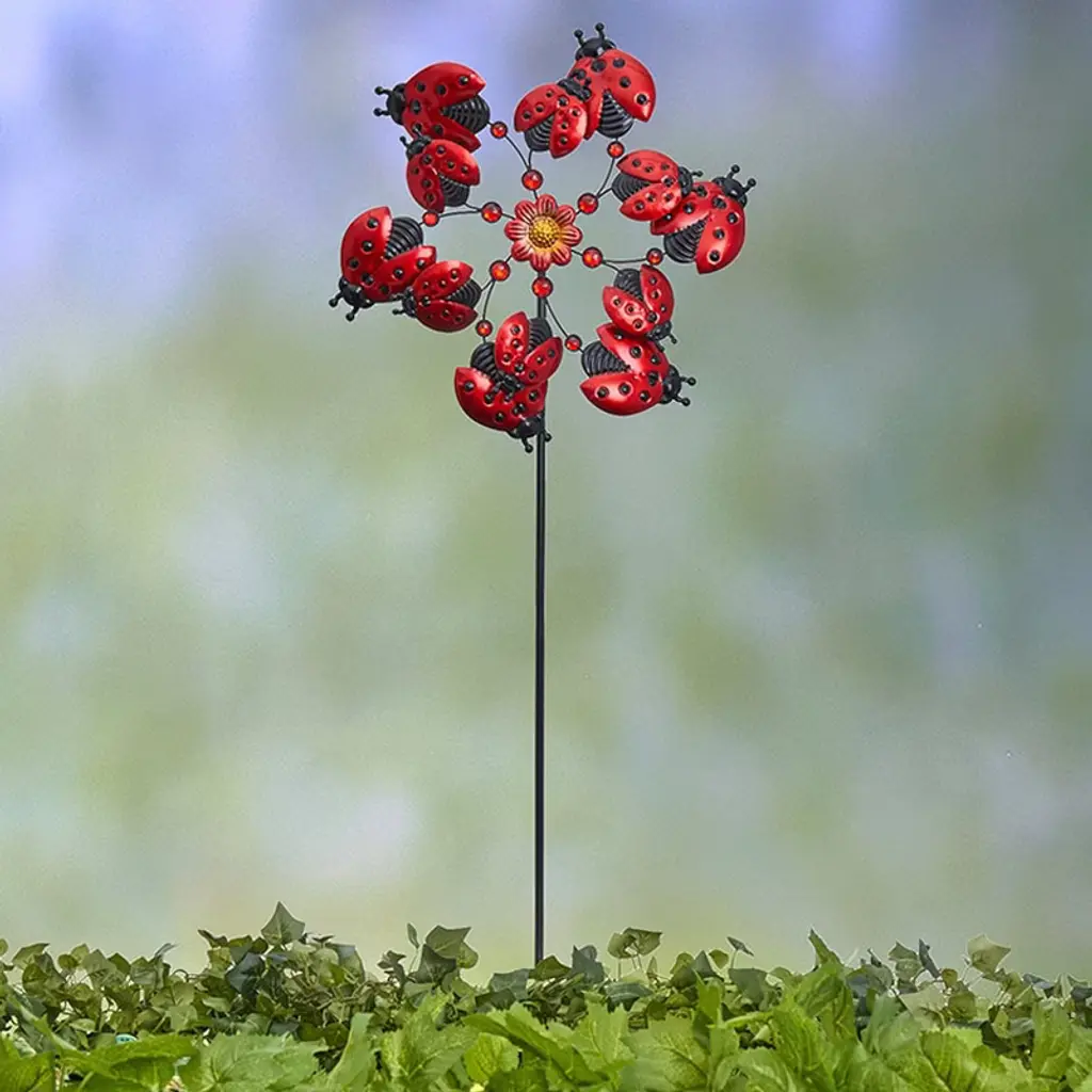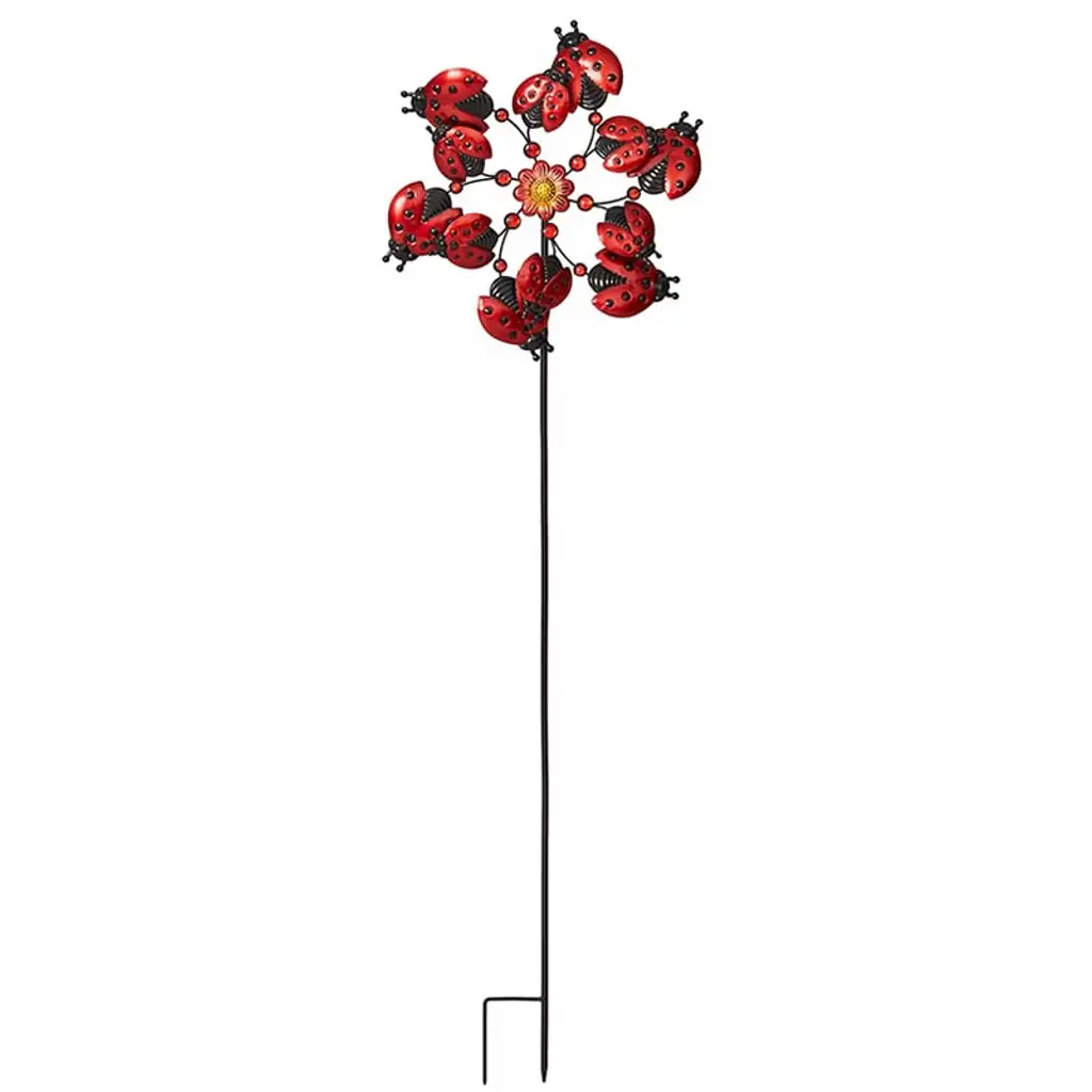 Add a unique animated touch to your outdoor spaces with this decorative ladybug wind spinner yard ornament. It spins in the wind and contributes beautiful color to your yard or garden. No matter where you place this wind spinner yard ornament, it will catch the eye of anyone passing by. Metal and PVC. 16-1/8"W x 3-1/2"D x 48-1/2"H, including the 5" ground stake.