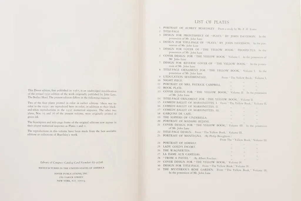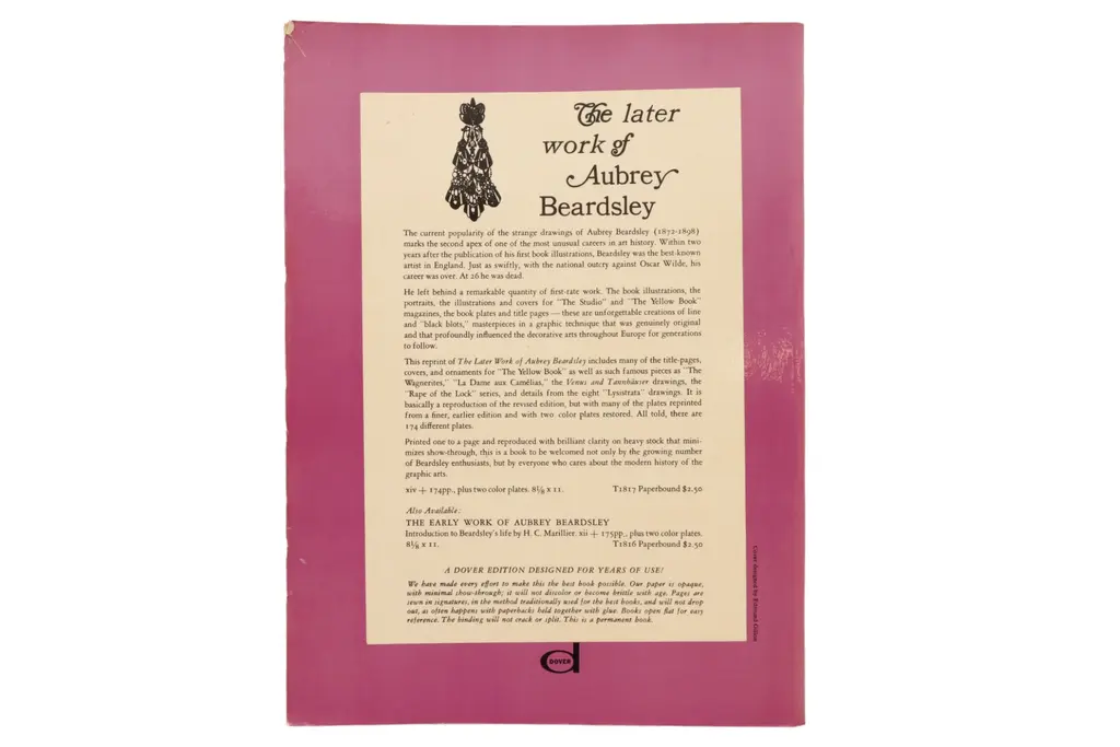 The Later Work of Aubrey Beardsley. Softcover book published in 1967 by Dover Publications, Inc., of New York. Printed in the United States. Illustrated, 174 plates with two in color, 174 pages.
