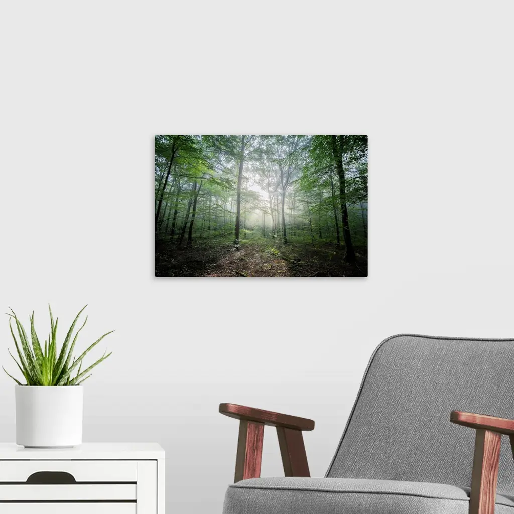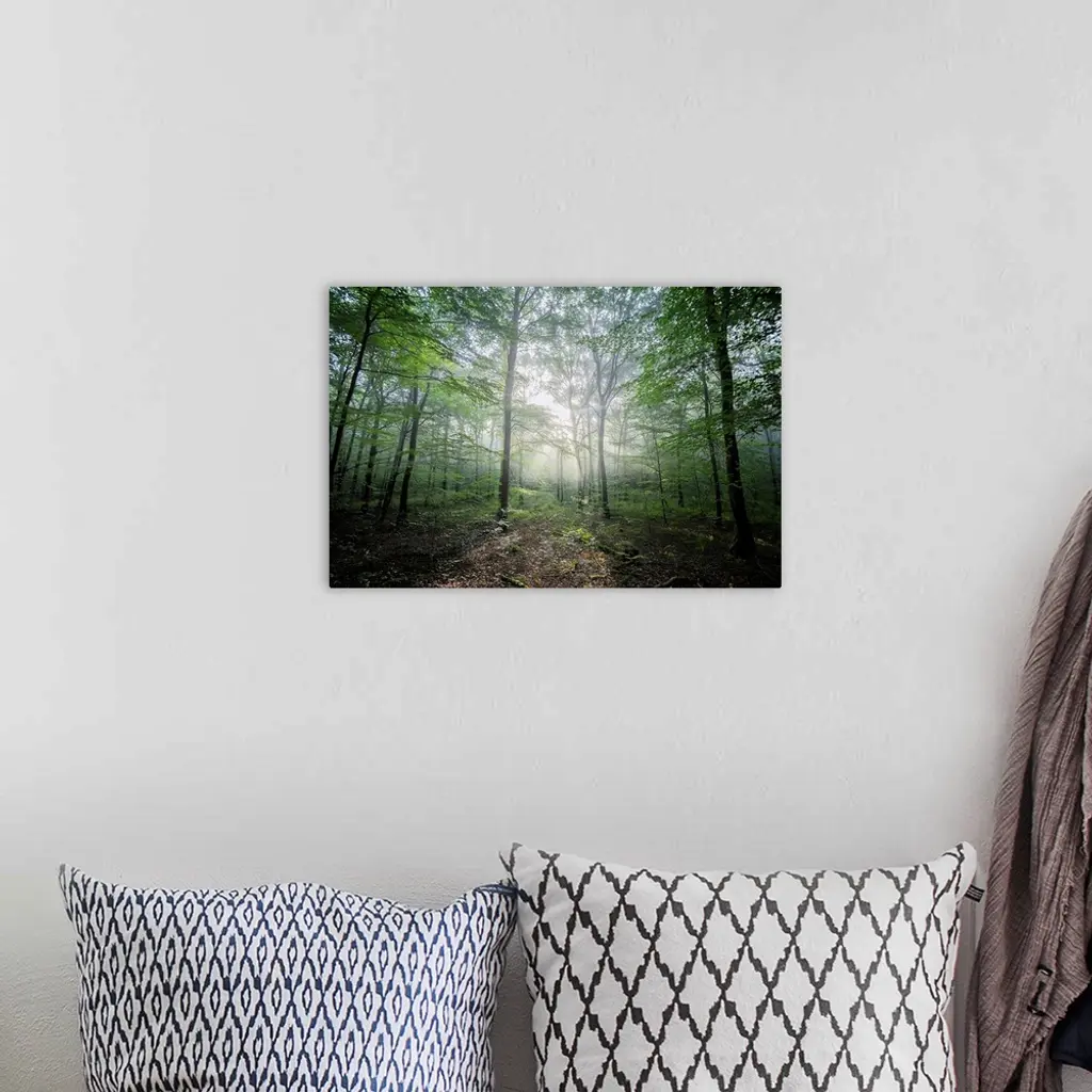 Forest view at fall with huge oak tree on the side with yellow leaves, a path crossing going away.