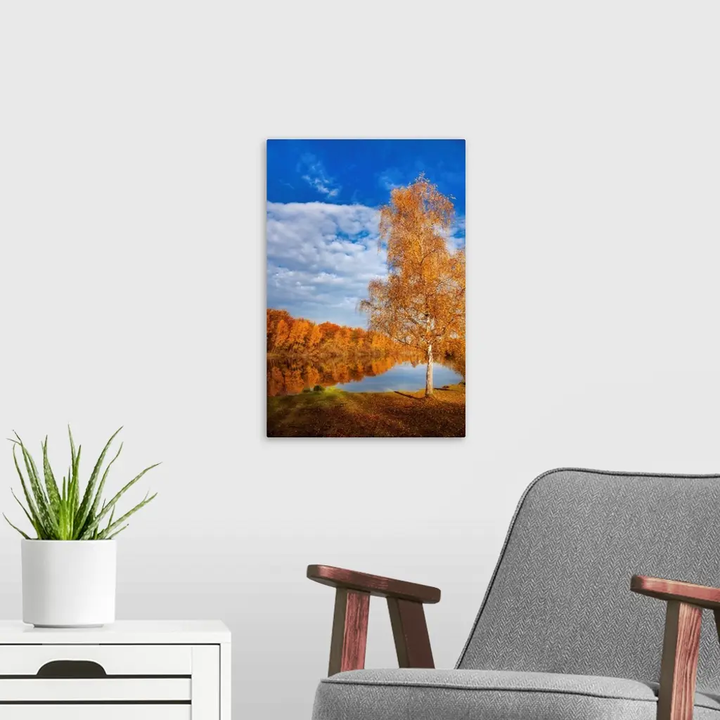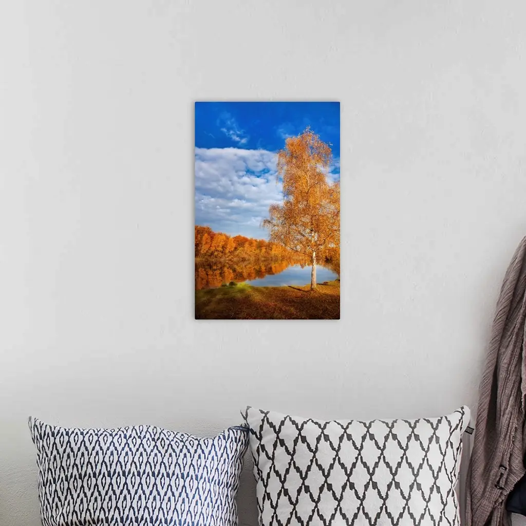 Autumn landscape with trees around a lake under a blue sky