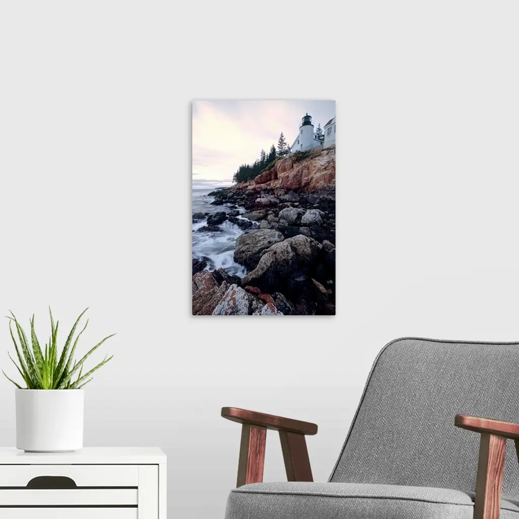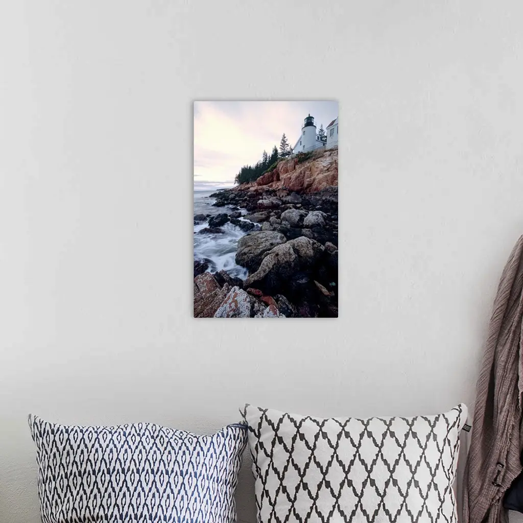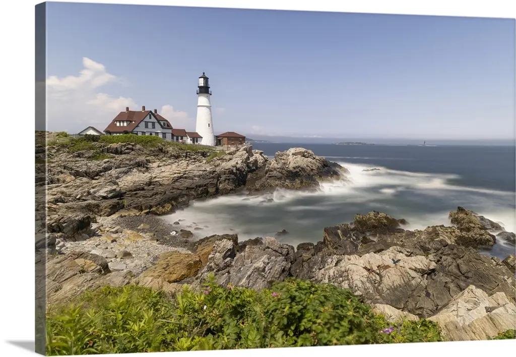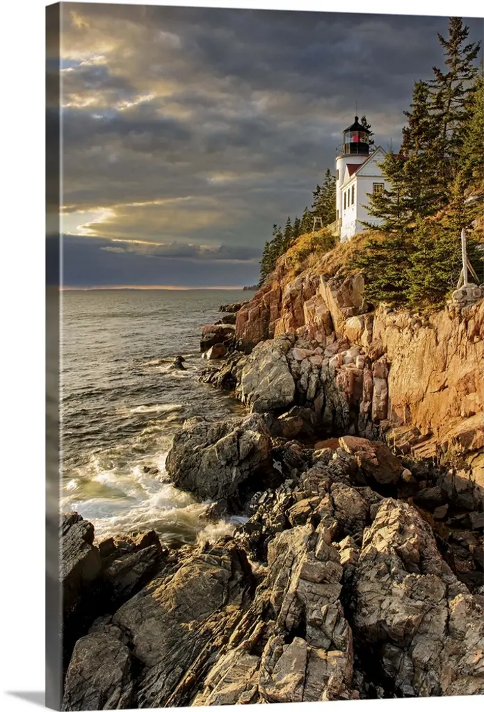 Low angle view of the bass harbor head lighthouse that sits atop a rocky cliff.