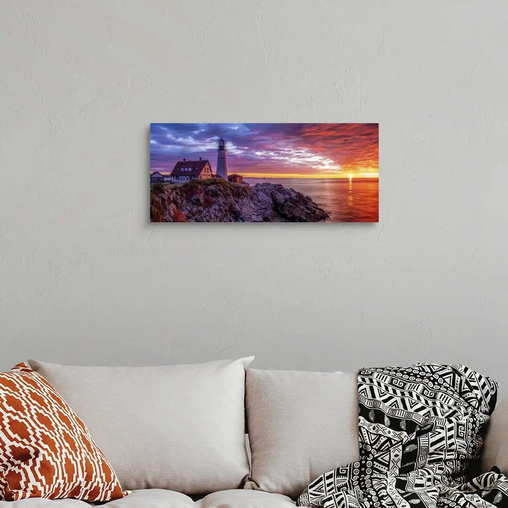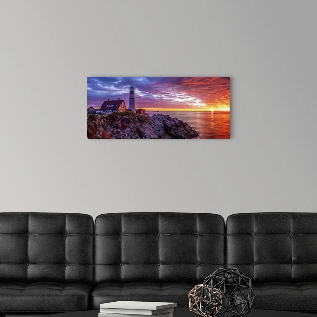 Portland Head Light is a historic lighthouse in Cape Elizabeth, Maine. I arrived before sunrise and waited. Mother Nature gave me a gift because it was a wonderful sunrise with intense red colors and a fantastic sky. I got this photo by merging three shots to make a panoramic photo.