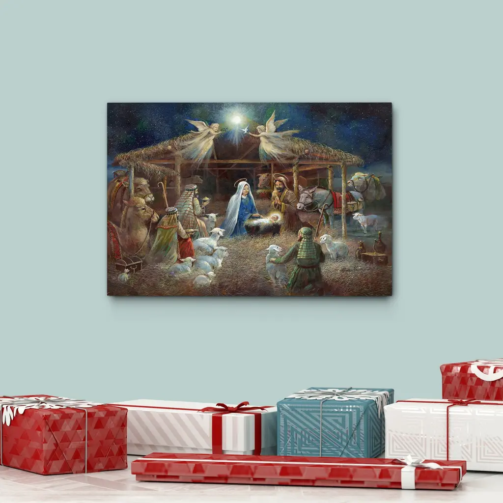 Artist: The Macneil StudioSubject: PeopleStyle: Modern & ContemporaryProduct Type: Gallery-Wrapped Canvas ArtMade in USAThis ready to hang, gallery-wrapped art piece features Mary, Joseph, and the three kings admiring Jesus in the manger.Richard Macneil, a self taught artist, formed The Macneil Studio in 2009 with his wife Judi and their sons Daniel and Kyle. Born in Winchester, Macneil started his working life as an artist at Worcester Royal Porcelain and has always worked in the fields of sculpture, ceramics, and illustration, both in the UK and internationally. He spent many years living on the east coast of the USA, then returned to Worcestershire and freelanced as an artist and greeting card designer. Richard spends any spare time he has with his family walking in the beautiful British countryside and fishing.Giclee (jee-clay) is an advanced printmaking process for creating high quality fine art reproductions. The attainable excellence that Giclee printmaking affords makes the reproduction virtually indistinguishable from the original piece. The result is wide acceptance of Giclee by galleries, museums, and private collectors. Gallery wrap is a method of stretching an artist's canvas so that the canvas wraps around the sides and is secured a hidden, wooden frame. This method of stretching and preparing a canvas allows for a frameless presentation of the finished painting.